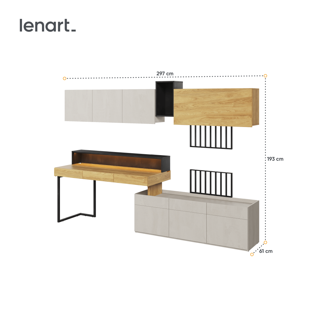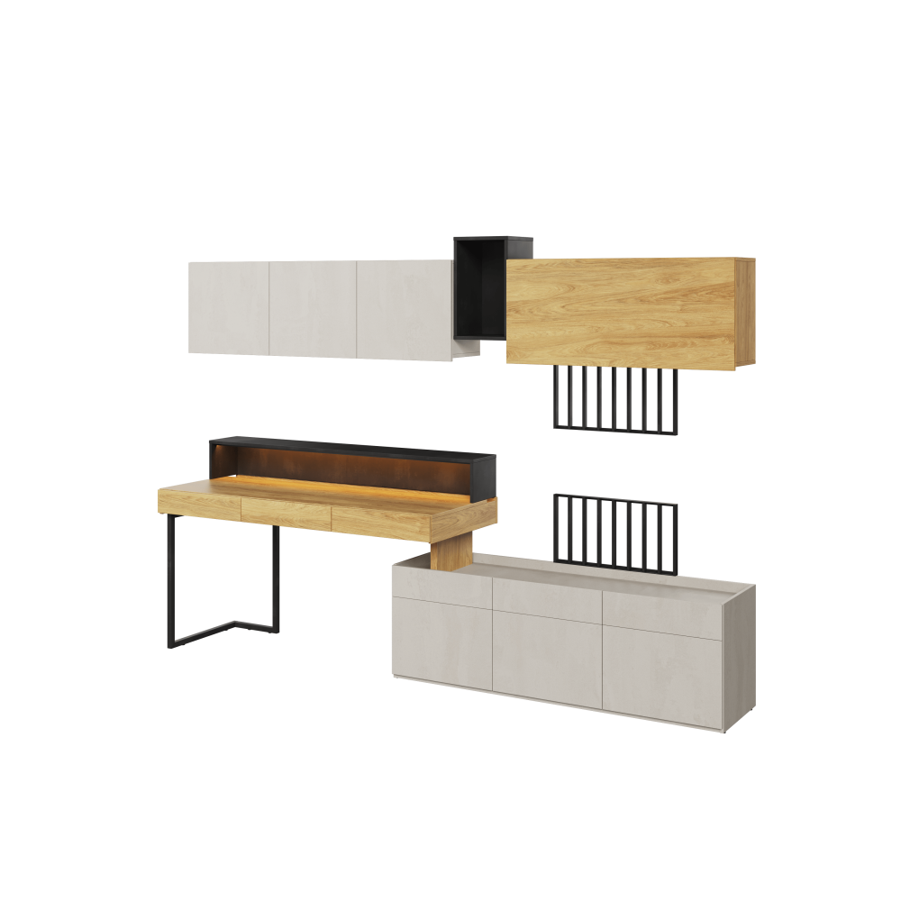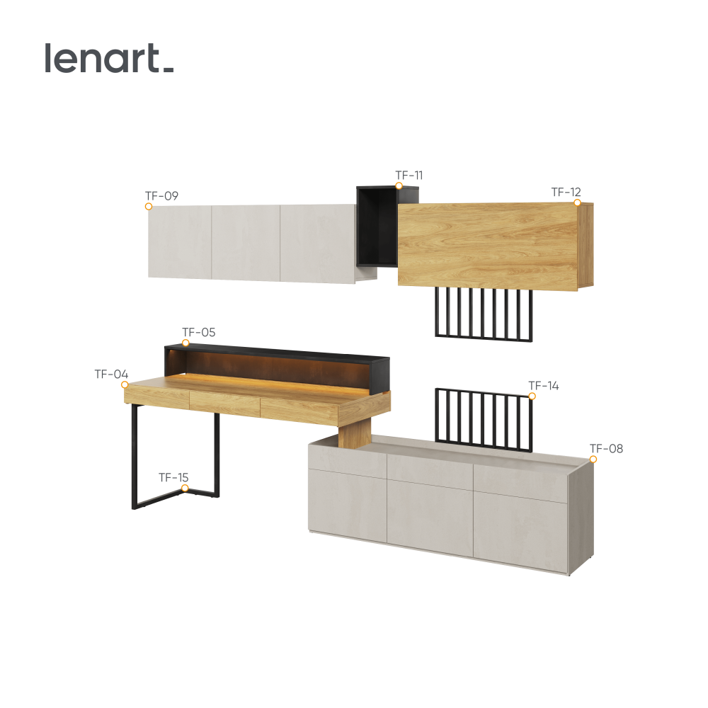 Zestaw mebli dla nastolatków TFS1 charakteryzuje się nowoczesnym stylem, w którym biel, drewniane akcenty oraz szarość łączą się, nadając wnętrzu elegancji i świeżości. Kolorystyka optycznie powiększa przestrzeń, a starannie dobrane elementy zapewniają praktyczność oraz miejsce do przechowywania i organizacji. Zestaw doskonale sprawdza się zarówno w nauce, jak i relaksie, zapewniając funkcjonalne rozwiązania do pokoju młodzieżowego. Składa się z biurka TF-04, nadstawki TF-05, szafek wiszących TF-09 i TF-12, półki TF-11, dwóch paneli TV TF-14 oraz szafki TF-08.