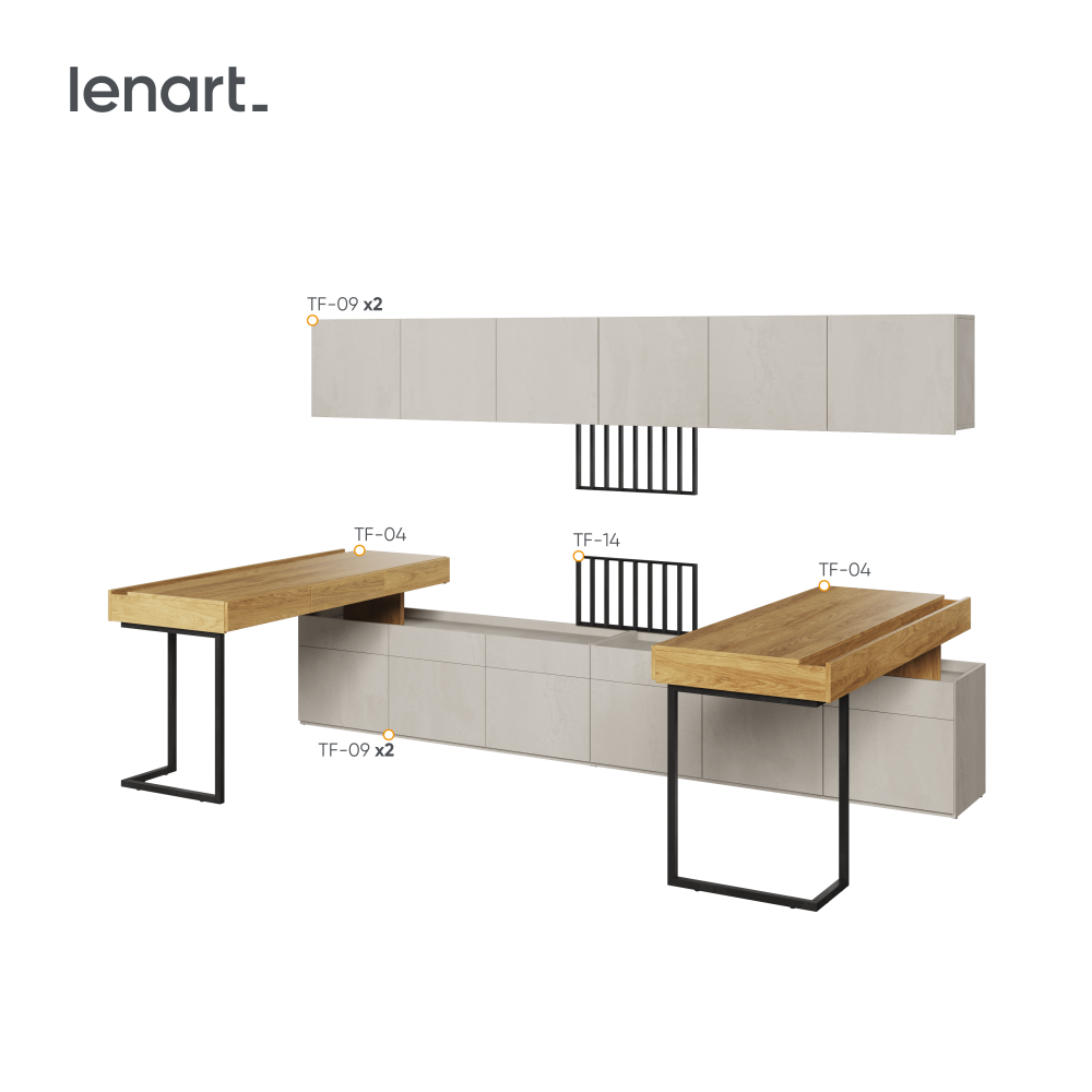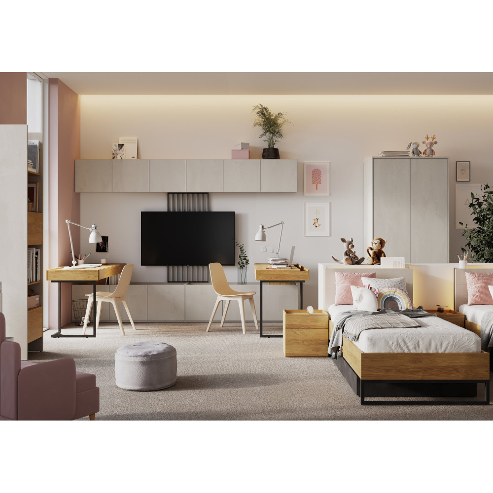 Zestaw mebli dla nastolatków to idealne rozwiązanie, które nie tylko oferuje gotowy pomysł na designerską aranżację pokoju, ale także umożliwia maksymalne wykorzystanie potencjału przestrzeni. Składa się z siedmiu elementów: dwóch biurek TF-04, dwóch szafek wiszących TF-09, dwóch paneli TV TF-14 oraz dwóch szafek TF-08. Nowoczesny design oraz uniwersalna kolorystyka zestawu sprawiają, że doskonale sprawdzi się zarówno w pokojach dziewcząt, jak i chłopców. Dzięki solidnemu wykonaniu i przemyślanej funkcjonalności, meble te będą służyć przez wiele lat, dostosowując się do zmieniających się potrzeb ich użytkowników. To idealne połączenie estetyki i praktyczności, które sprzyja tworzeniu inspirującej przestrzeni do nauki, zabawy i relaksu.