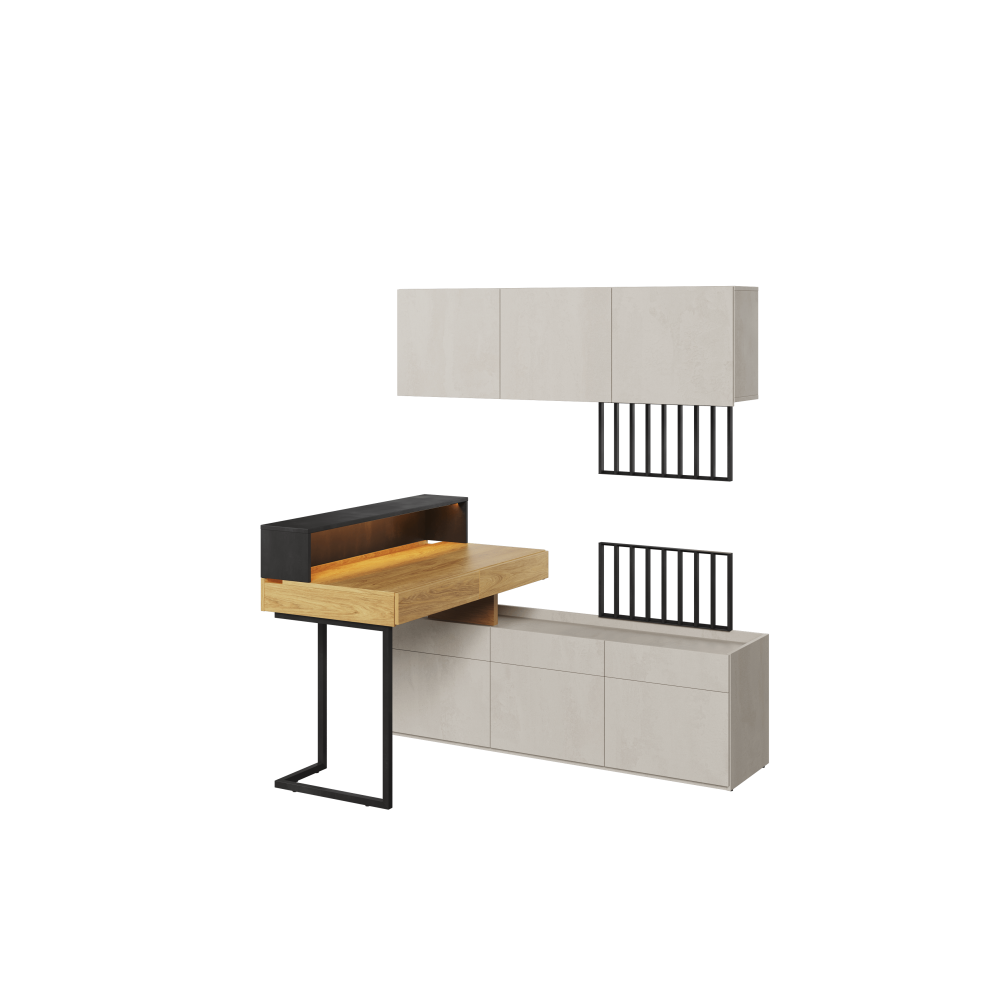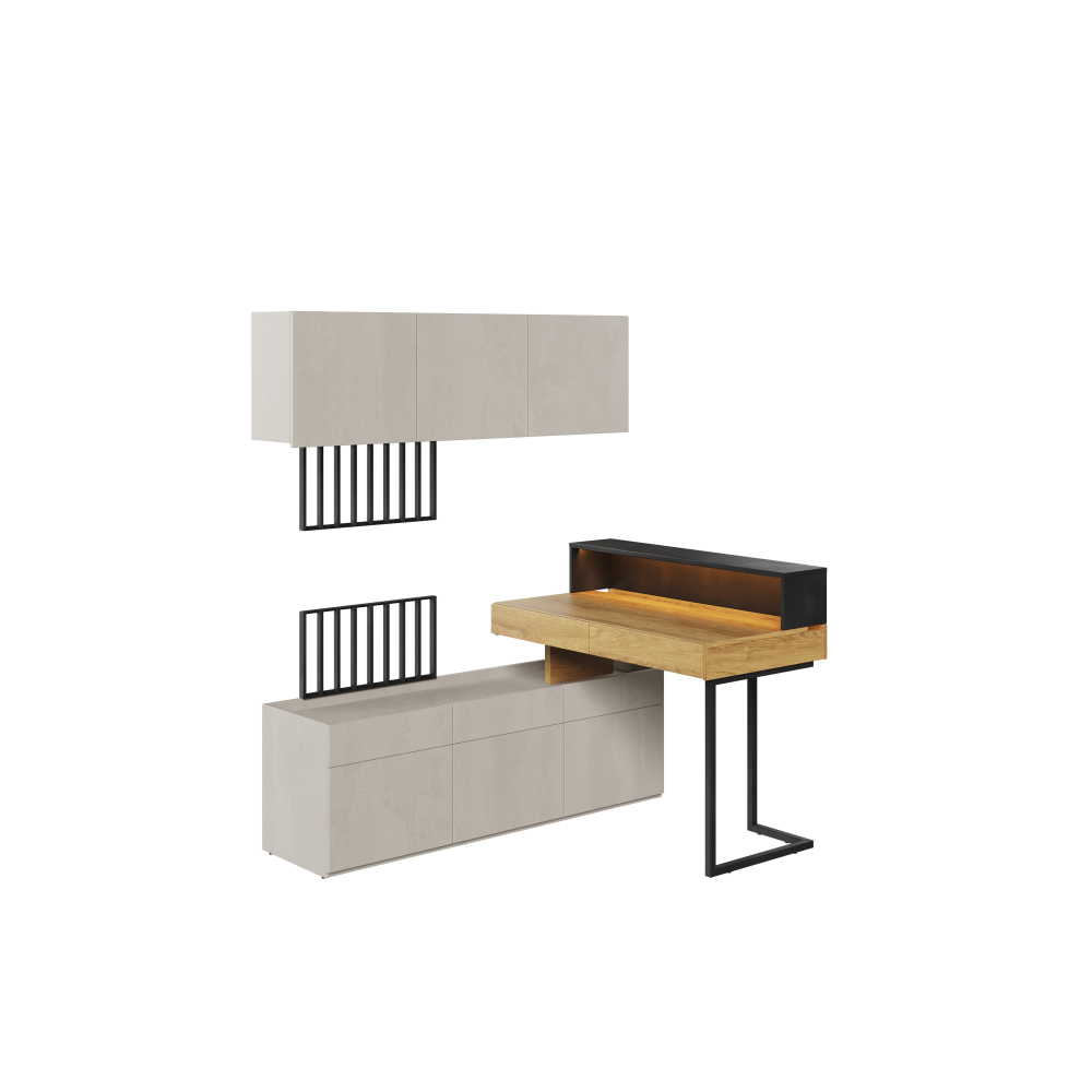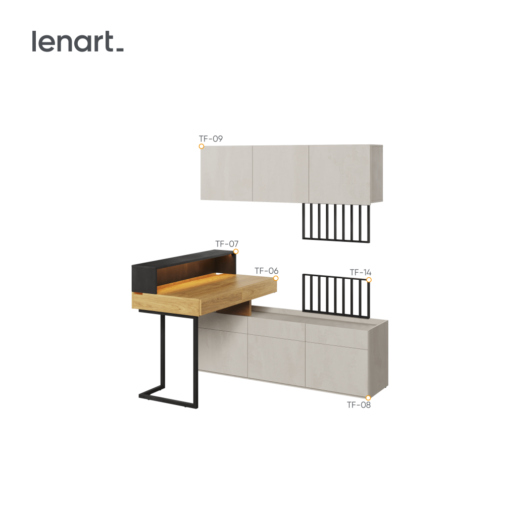 Nowoczesne meble to doskonałe rozwiązanie dla tych, którzy pragną stworzyć wnętrze o wyjątkowym klimacie. Zestaw SET-07, zaprojektowany z myślą o graczach, składa się z pięciu elementów: biurka TF-06, nadstawki TF-07, szafki TF-08, panelu TV TF-14 oraz szafki wiszącej TF-09. Zestaw SET-07 te oferują ergonomiczną przestrzeń, która jest idealna zarówno do nauki, jak i do zabawy, zapewniając jednocześnie dużo miejsca do przechowywania. Kolekcja mebli młodzieżowych wyróżnia się nowoczesną kolorystyką, łącząc naturalny odcień dębu hikory z odcieniami szarości oraz industrialnym akcentem w kolorze surowej  stali.