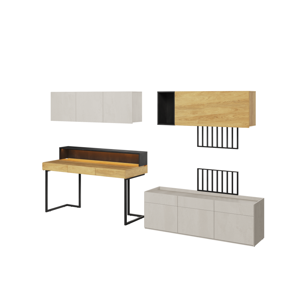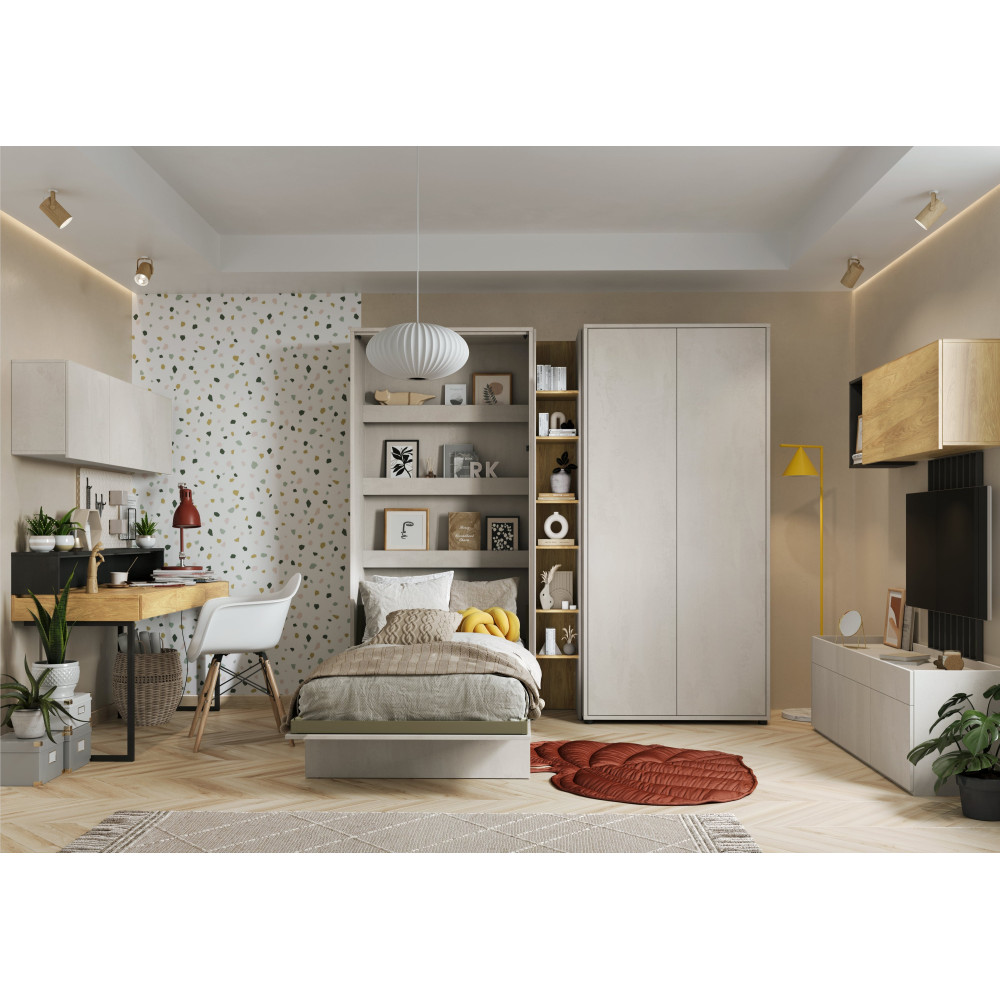 Zestaw mebli dla nastolatków SET-09A charakteryzuje się nowoczesnym stylem, który łączy biel, szarość i ciepłe, drewniane akcenty, nadając przestrzeni elegancji i lekkości. Starannie dobrane elementy nie tylko tworzą funkcjonalną i estetyczną przestrzeń, ale także zapewniają praktyczne rozwiązania do przechowywania i organizacji, idealnie dopasowane do potrzeb młodzieży.