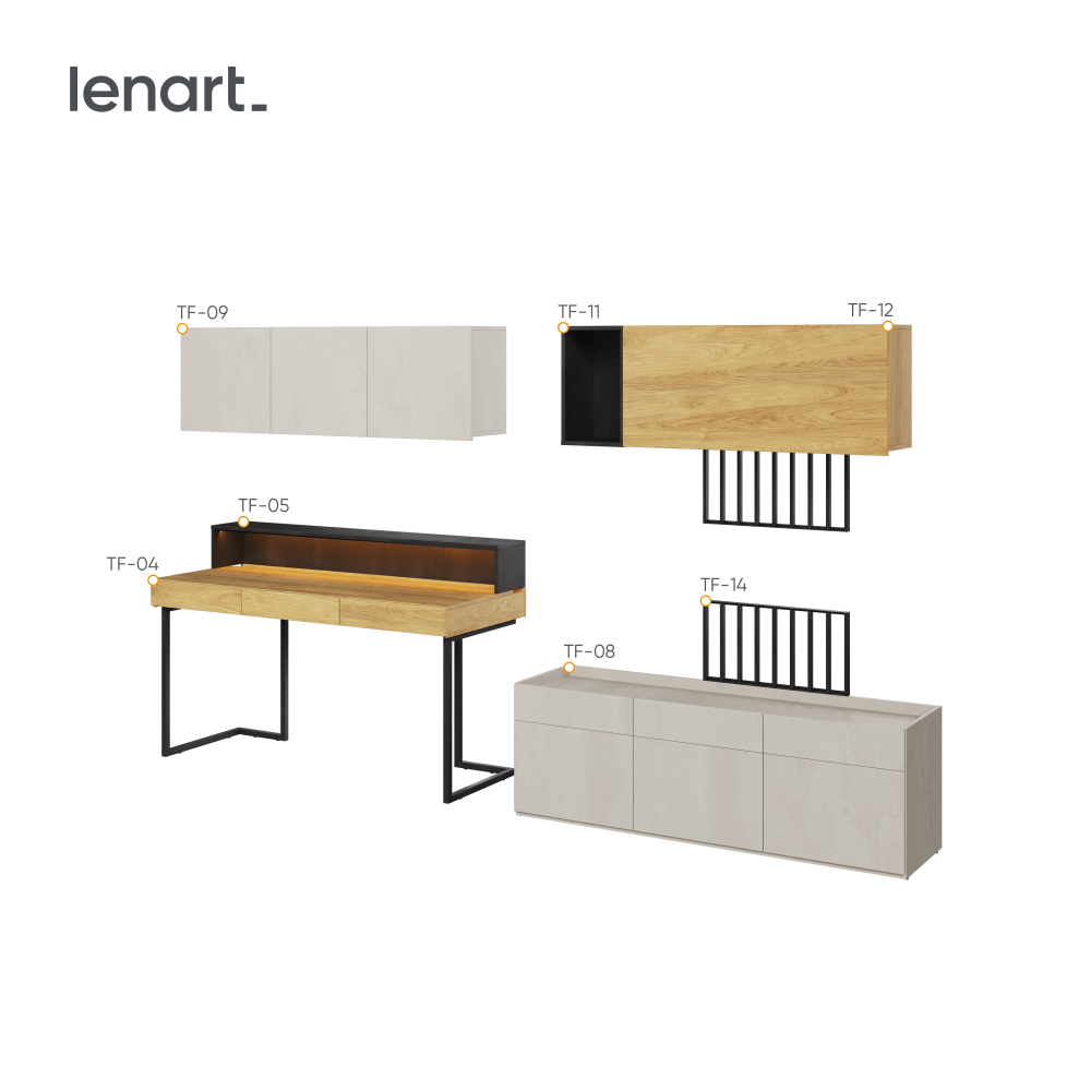 Zestaw SET-09A składa się z elementów takich jak biurko TF-04, noga do biurka TF-15, nadstawka TF-05, szafki wiszące TF-09 i TF-12, dwa panele TV TF-14, półka TF-11 oraz szafka TF-08. Dzięki takiemu układowi młodzież zyskuje komfortowe miejsce do nauki, rozrywki oraz przechowywania, co sprawia, że przestrzeń jest zarówno nowoczesna, jak i wyjątkowo praktyczna.