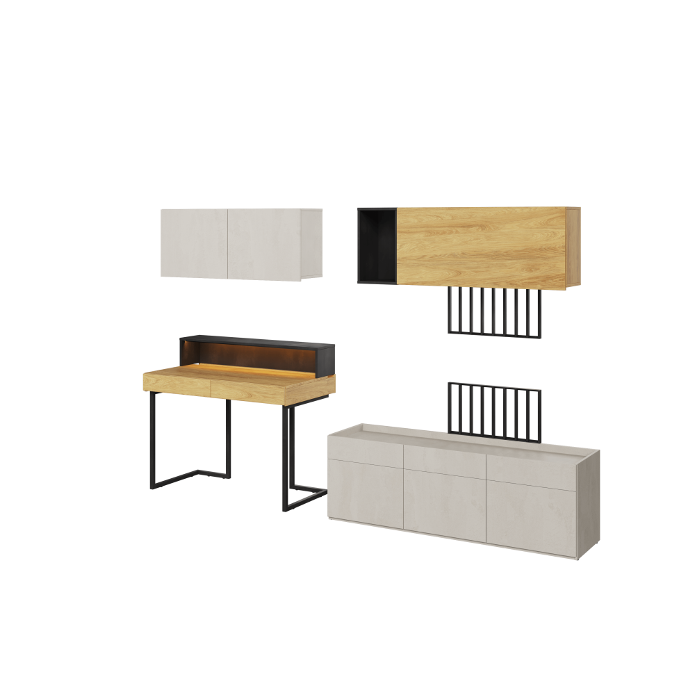 Zestaw SET-09B obejmuje starannie dobrane elementy, takie jak: przestronne biurko TF-06+TF-15, funkcjonalna nadstawka TF-07, wiszące szafki TF-10 i TF-12, dwa panele TV TF-14, półka TF-11 oraz pojemna szafka TF-08. Taka konfiguracja zapewnia wiele miejsca na przechowywanie, tworząc uporządkowaną i estetyczną przestrzeń, która świetnie wpisze się zarówno w pokoje dziewczęce, jak i chłopięce. Dzięki uniwersalnej kolorystyce i ponadczasowemu wzornictwu zestaw będzie służyć przez lata, a jego funkcjonalność pozwoli na łatwe dopasowanie do zmieniających się potrzeb użytkownika.
