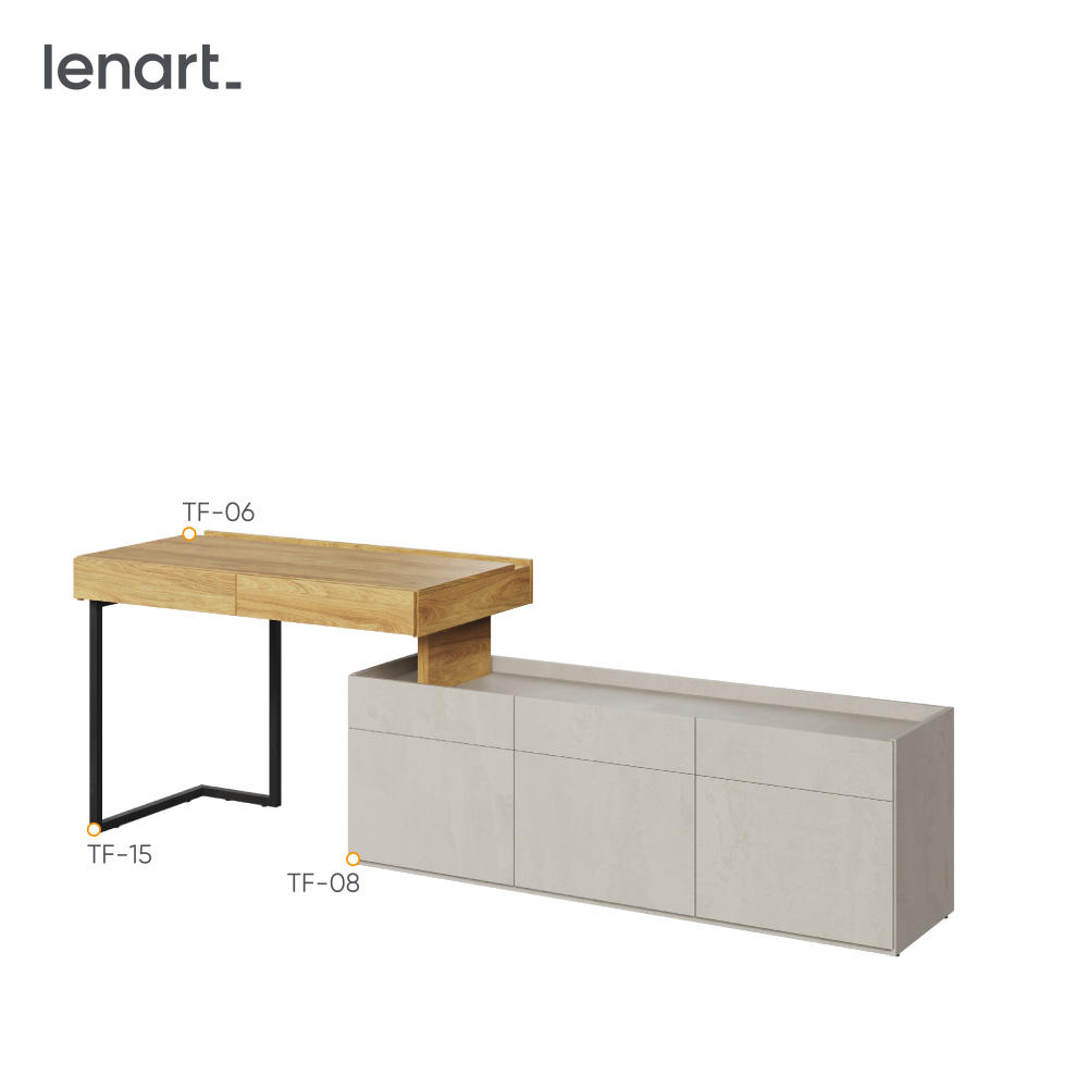Biurko TF-06 w zestawie z trzydrzwiową szafką TF-08 to doskonałe połączenie funkcjonalności i stylu. Biurko zapewnia wygodne miejsce do pracy lub nauki, a szafka oferuje przestronną opcję przechowywania, idealną do organizacji książek i materiałów biurowych.