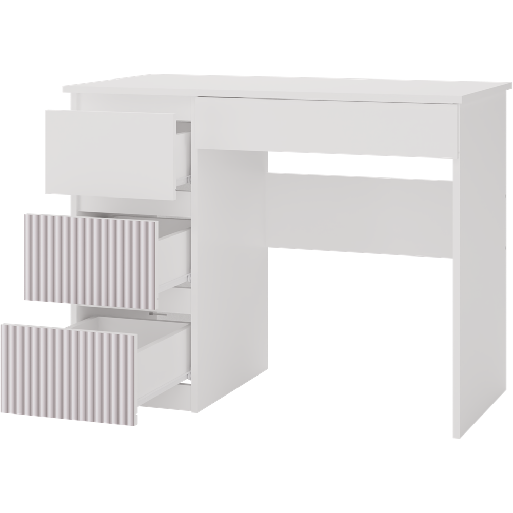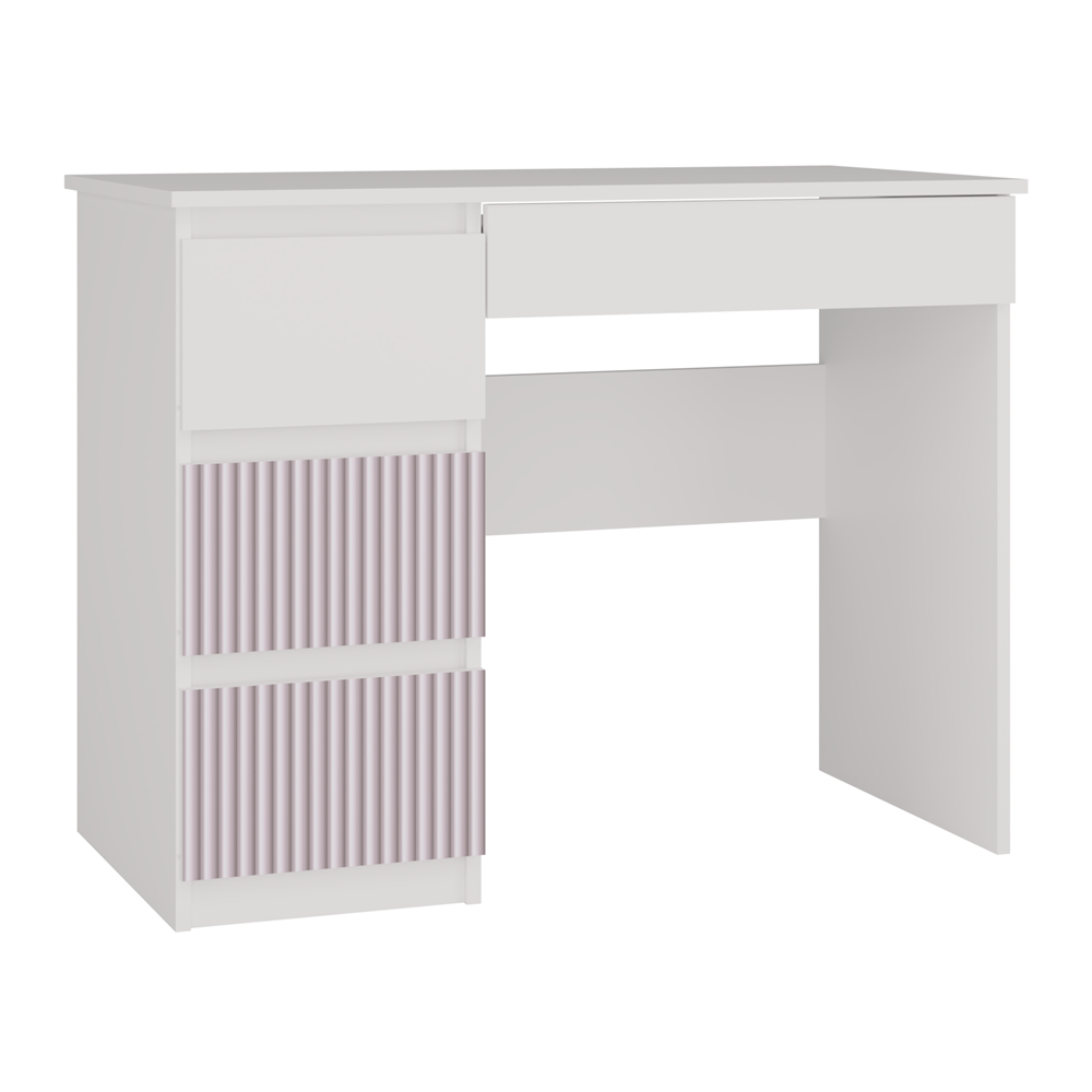- 3 pojemne wysokie szuflady z lewej strony (w tym 2 szuflady z różowymi wzorami) i 1 niska z prawej strony pod blatem