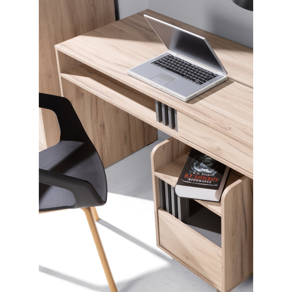 System meblowy Alikante to kompleksowy zestaw mebli, który cechuje się nowoczesnym designem oraz wysoką funkcjonalnością. Głównym materiałem używanym do produkcji tych mebli jest płyta laminowana o odcieniach kolorystycznych Dąb Estana Jasny oraz elegancki Antracyt.