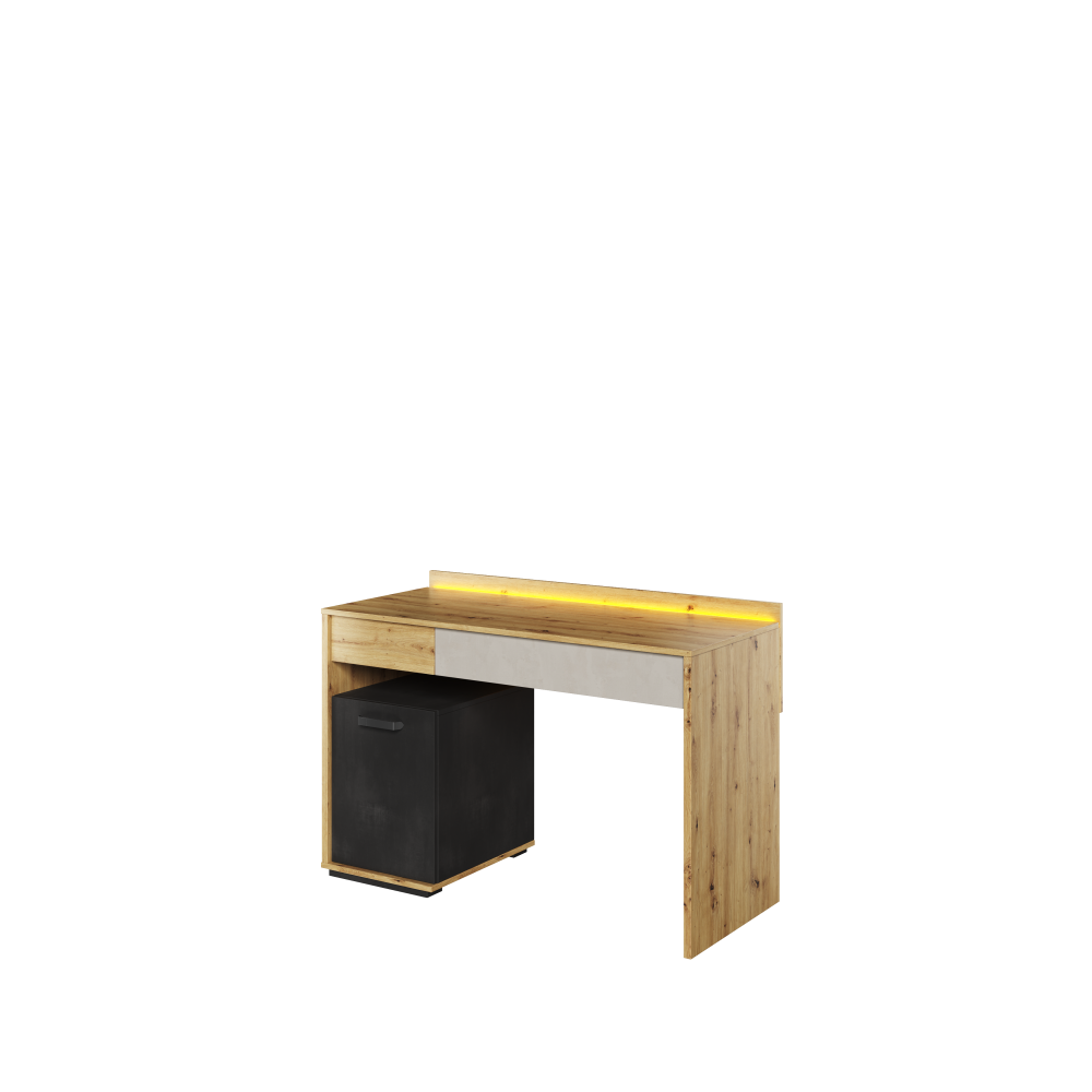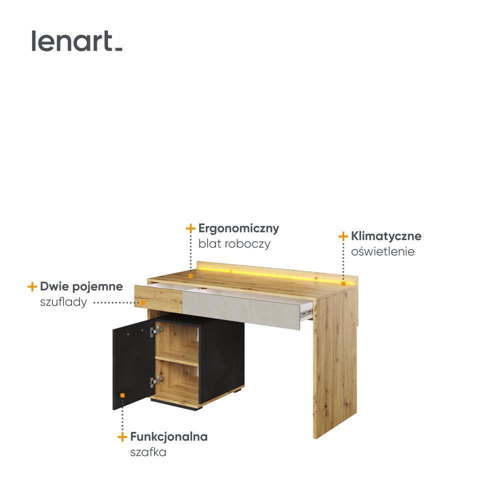 Nowoczesne biurko łączy elegancję z praktycznością, zapewniając komfortowe miejsce do pracy i nauki. Pod blatem znajdują się dwie łatwo dostępne szuflady idealne do przechowywania drobiazgów i akcesoriów biurowych. Biurko wyposażono również w szafkę z drzwiami, za którymi kryją się dwie pojemne półki. Całość utrzymana jest w stylowym odcieniu dębu artisan, który pięknie kontrastuje z ciemnymi akcentami szarości. Metalowe uchwyty podkreślają nowoczesny charakter biurka, a zawarte w zestawie oświetlenie LED nadaje mu elegancji i funkcjonalności.