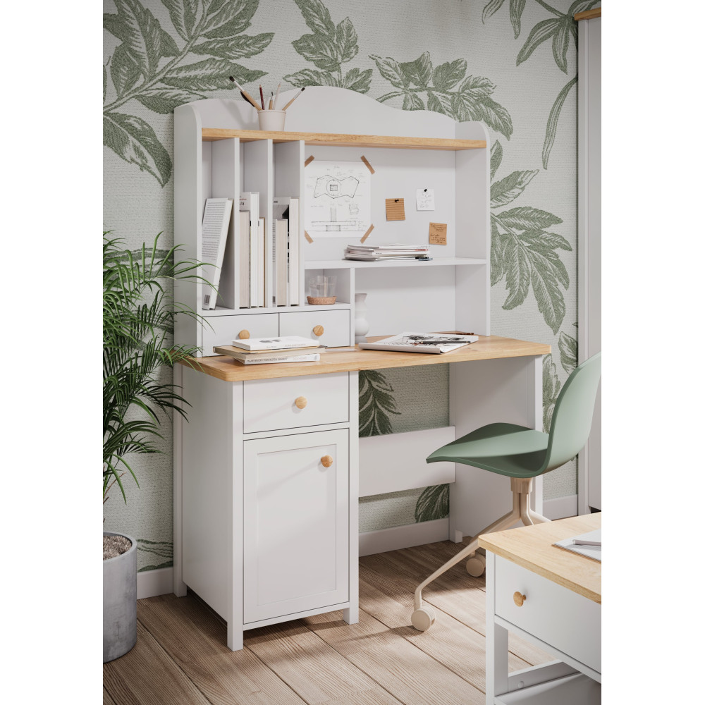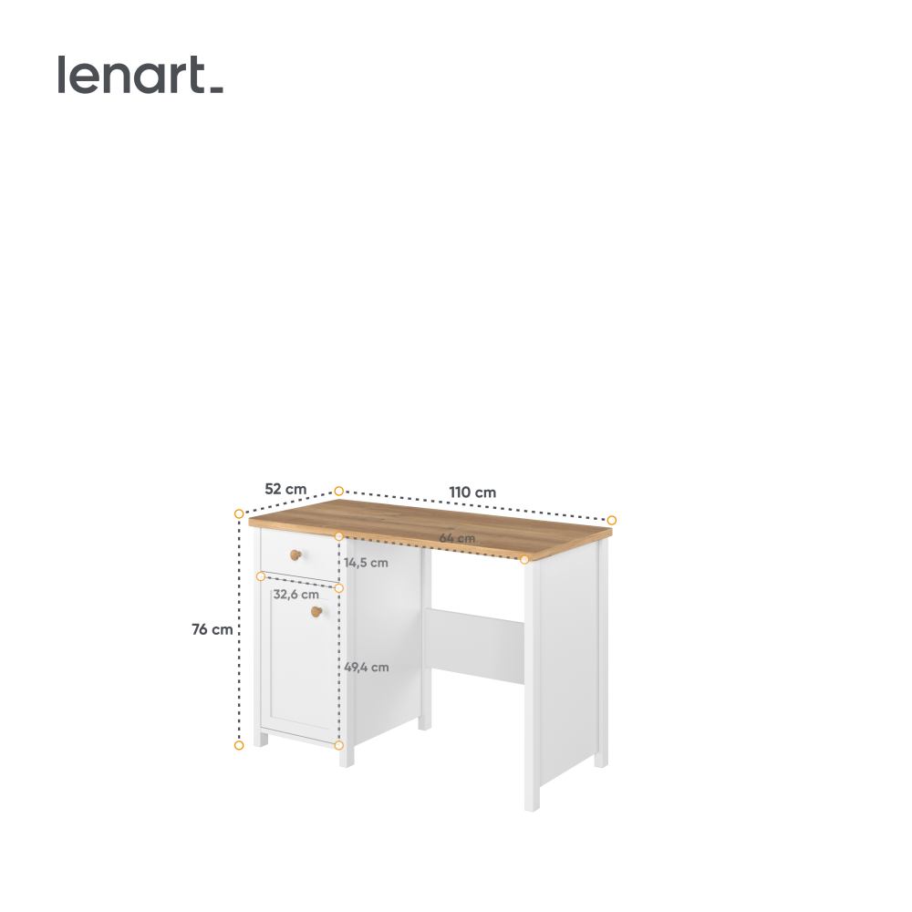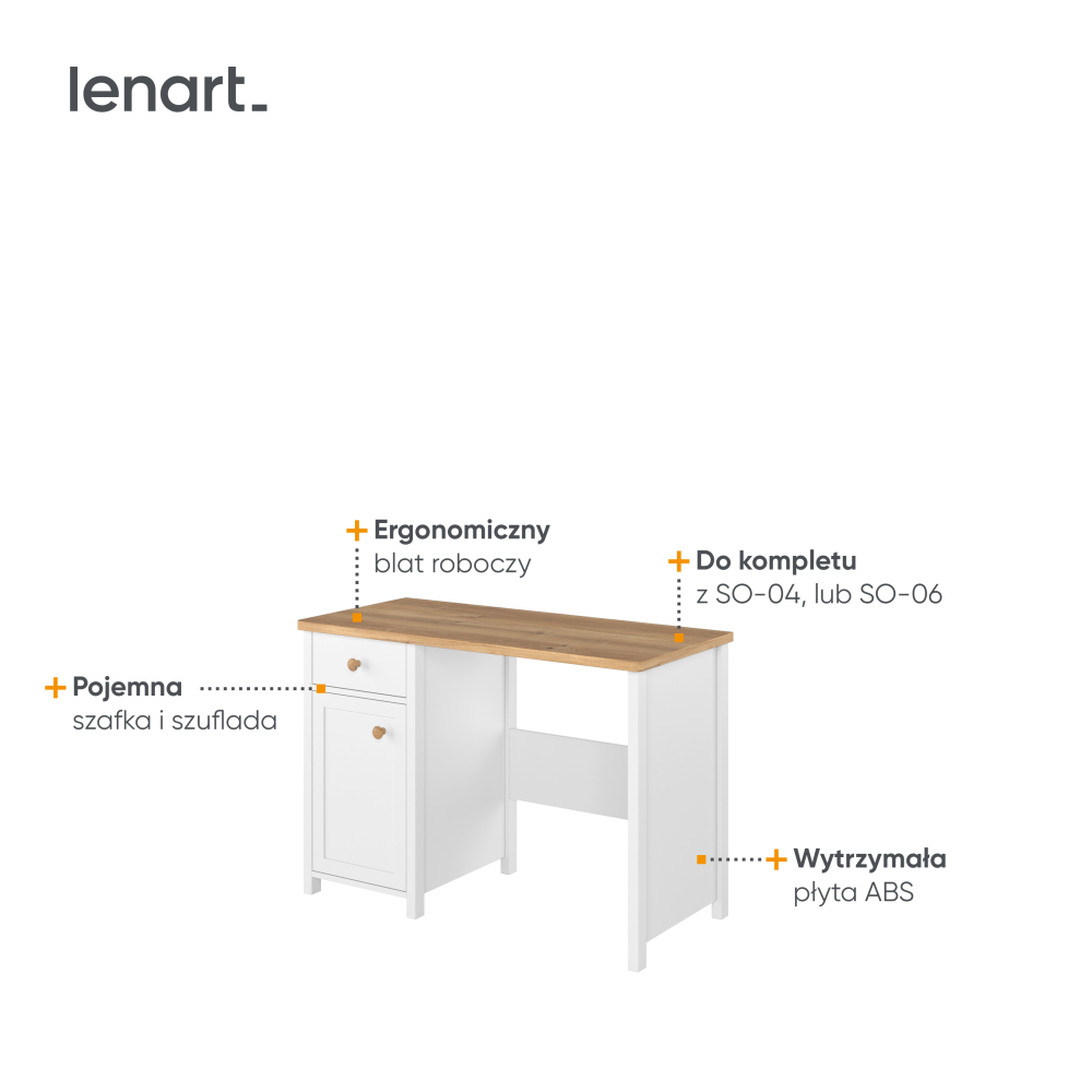 Wygodne w użytkowaniu biurko w kolorze białym, wyposażone w przestronny blat roboczy, idealne do nauki i pracy. Posiada praktyczną szafkę z drzwiami oraz podręczną szufladę, które zapewniają mnóstwo miejsca na przechowywanie materiałów biurowych lub akcesoriów.