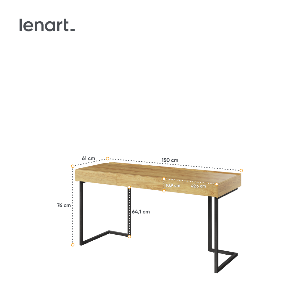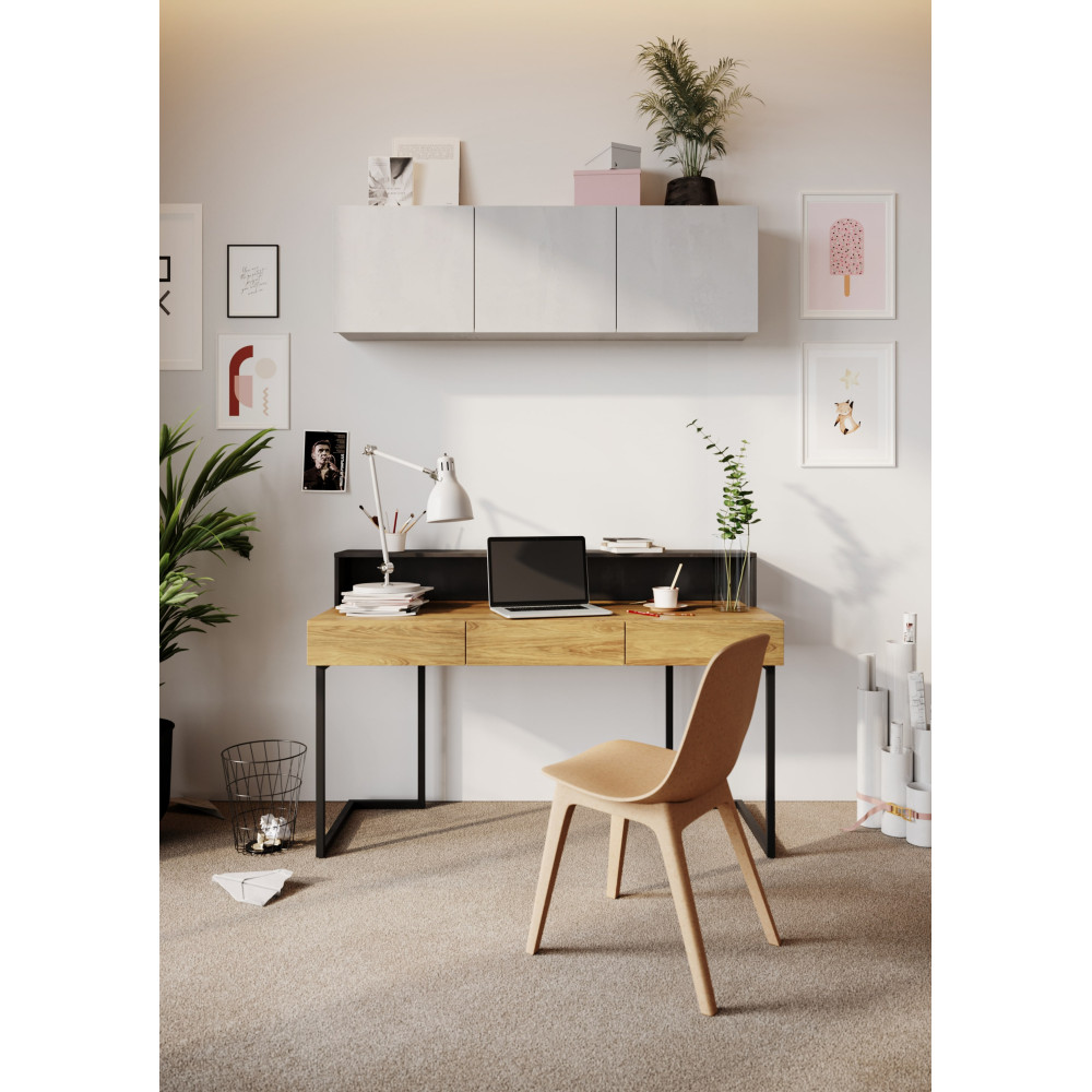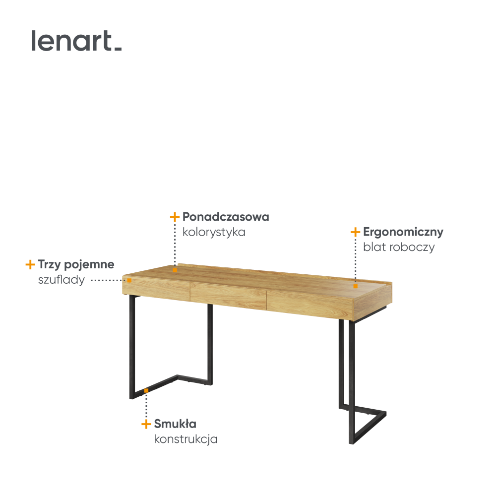 Biurko młodzieżowe to idealne połączenie nowoczesnego stylu i funkcjonalności, które doskonale sprawdzi się w pokoju nastolatka. Wykonane w eleganckim zestawieniu kolorystycznym dębu hikora i ciemnej stali, biurko wyróżnia się modnym designem, który z łatwością wpasuje się w każdą aranżację wnętrza. Wyposażone w pojemne szuflady, biurko oferuje wygodną przestrzeń do przechowywania książek, przyborów i akcesoriów, pomagając zachować porządek na blacie. Duża powierzchnia robocza zapewnia komfort pracy i nauki, a solidna konstrukcja wykonana z wysokiej jakości materiałów gwarantuje trwałość i stabilność.