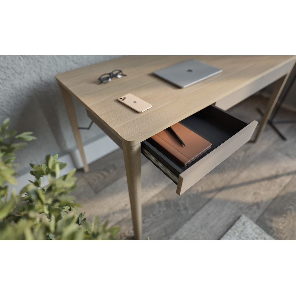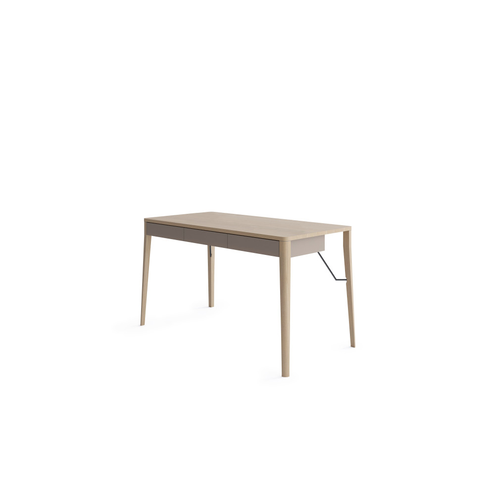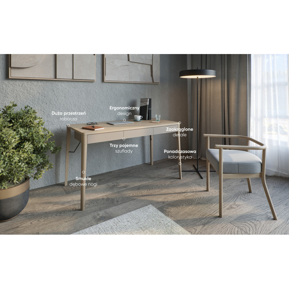 Biurko wyposażone jest w trzy pojemne szuflady, które umożliwiają przechowywanie niezbędnych przedmiotów i ułatwiają utrzymanie porządku. Smukłe, dębowe nogi nadają konstrukcji elegancji i stabilności. Duża przestrzeń robocza zapewnia komfort pracy i pozwala na swobodną organizację przestrzeni. Ergonomiczny design sprzyja wygodzie użytkowania, a zaokrąglone detale dodają subtelności. Ponadczasowa kolorystyka sprawia, że biurko idealnie wpasowuje się w różne aranżacje wnętrz.