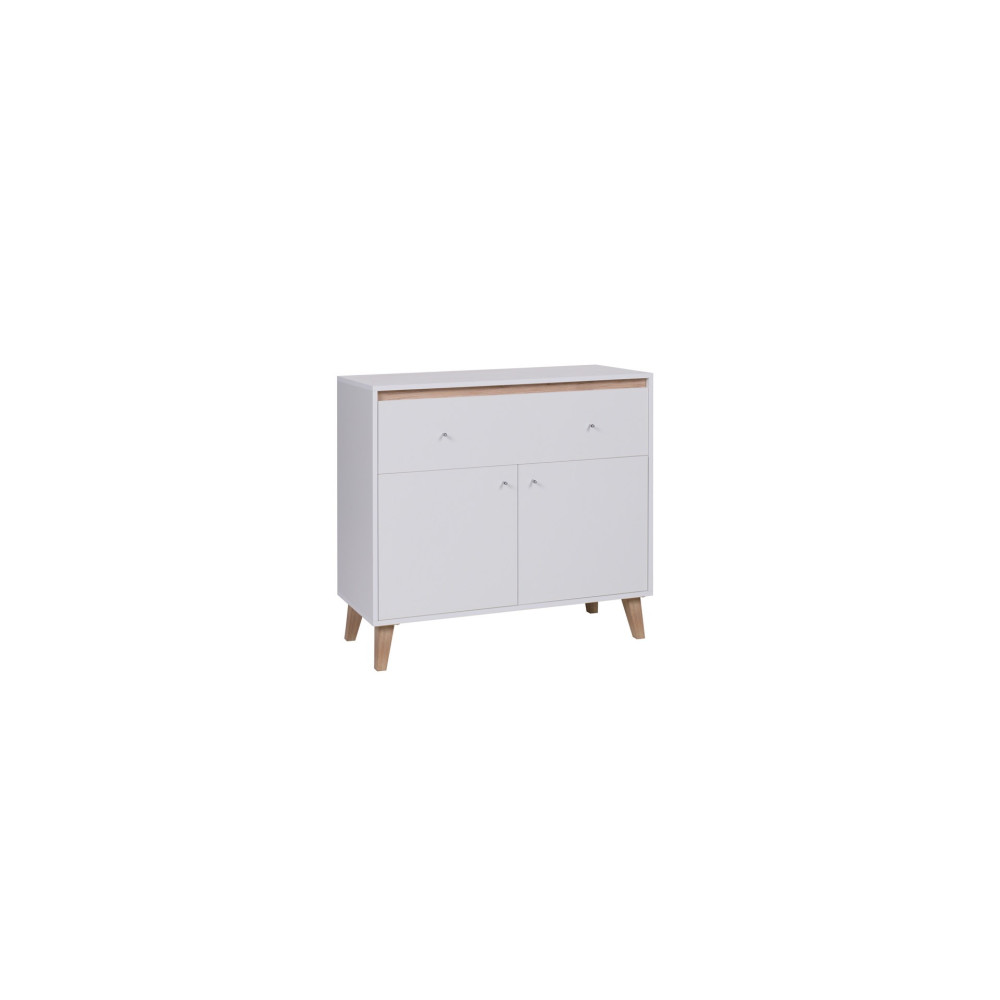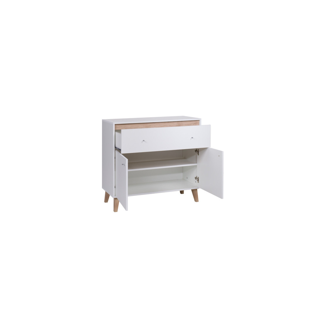- Korpus i front w kolorze białym, a wstawki i nogi w motywie Dąb San Remo jasnym