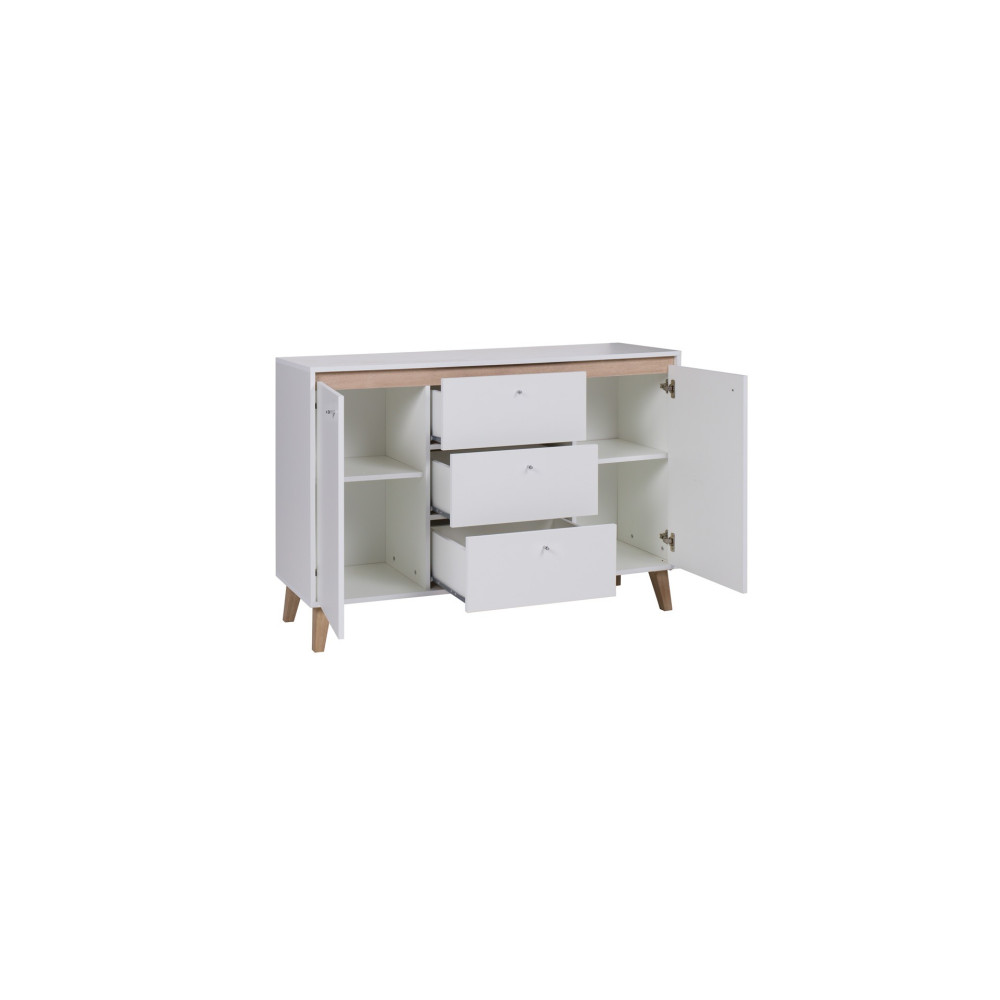 - Korpus i front w kolorze białym, a wstawki i nogi w motywie Dąb San Remo jasnym