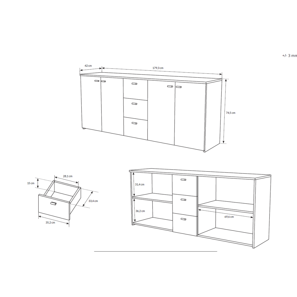 Front: płyta laminowana 16 mm odporna na wilgoć i zarysowania;