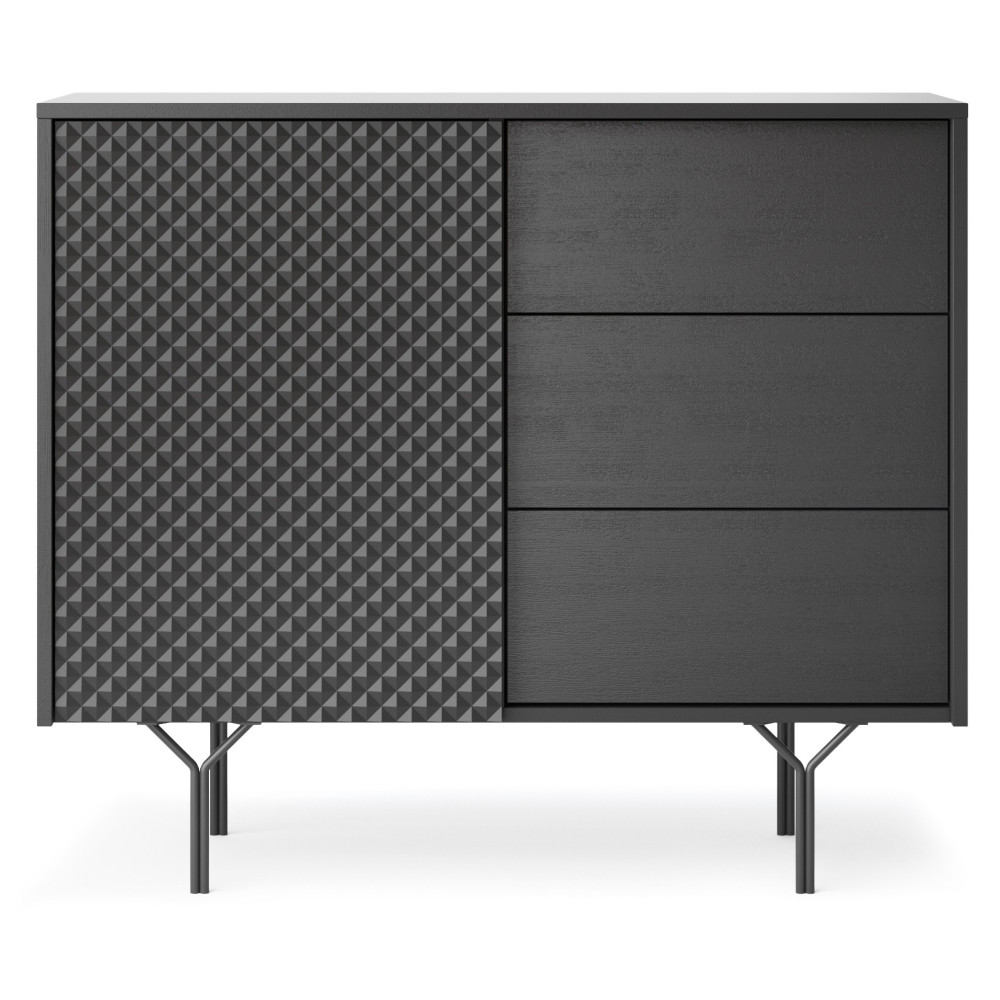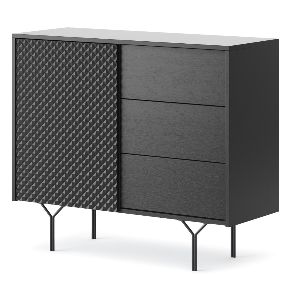 Nasza czarno-elegancka komoda o szerokości 97 cm, wysokości 83cm i głębokości 38cm to doskonały dodatek do Twojego wnętrza, który połączy nowoczesny styl z funkcjonalnością. Jej długie nóżki o wysokości 18 cm nadają meblowi lekkości i elegancji, jednocześnie zapewniając stabilność.