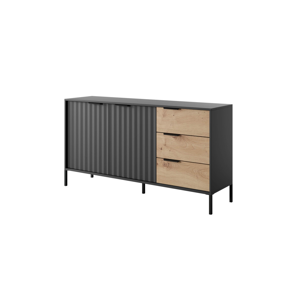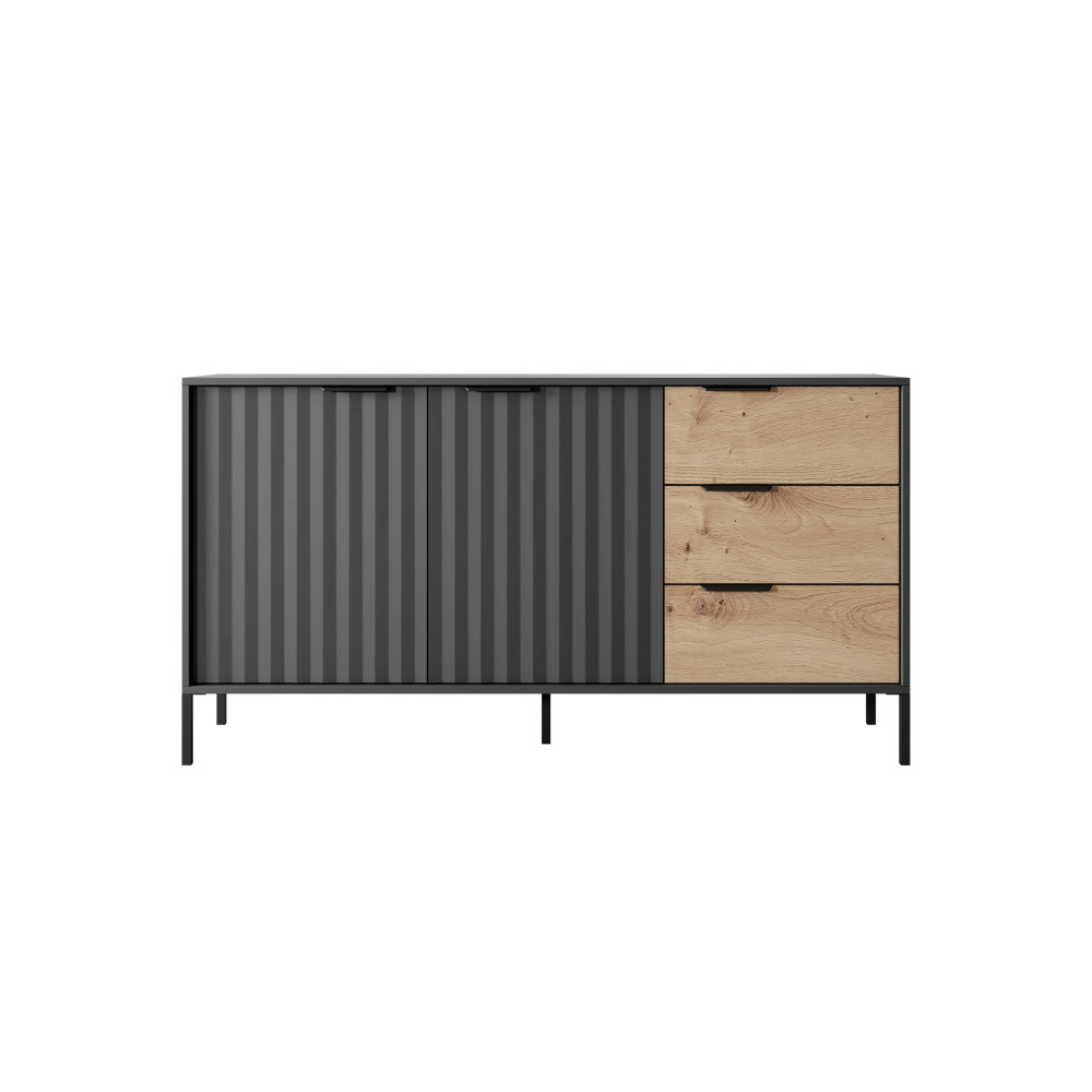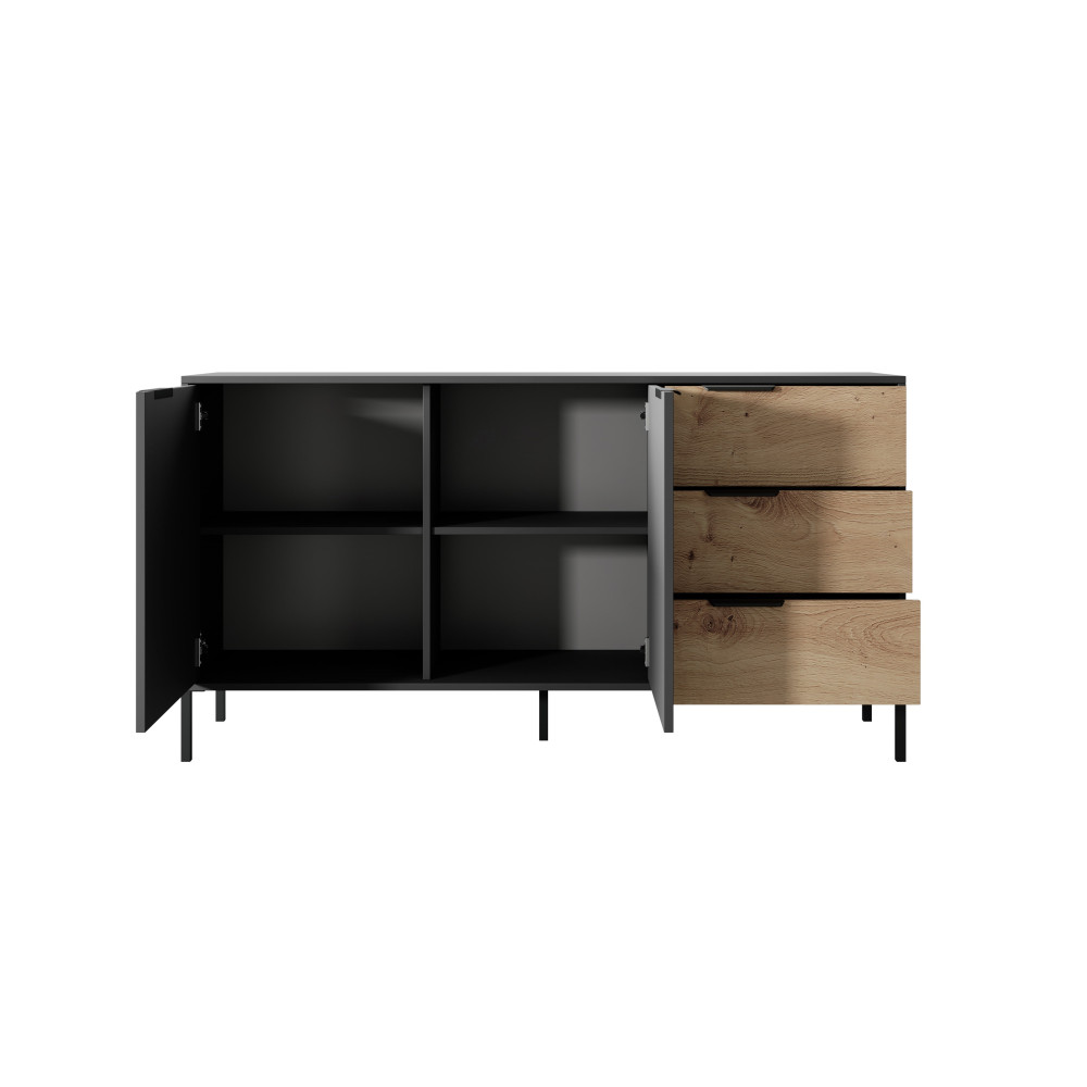 Front komody składa się z płyty wiórowej laminowanej o grubości 16 mm, która została uzupełniona o dąb artisan. To połączenie czerni i naturalnego drewna nadaje meblowi wyjątkowego charakteru i wyróżnia go spośród innych mebli. Ten kontrast kolorystyczny dodaje również ciepła i elegancji całej kompozycji.