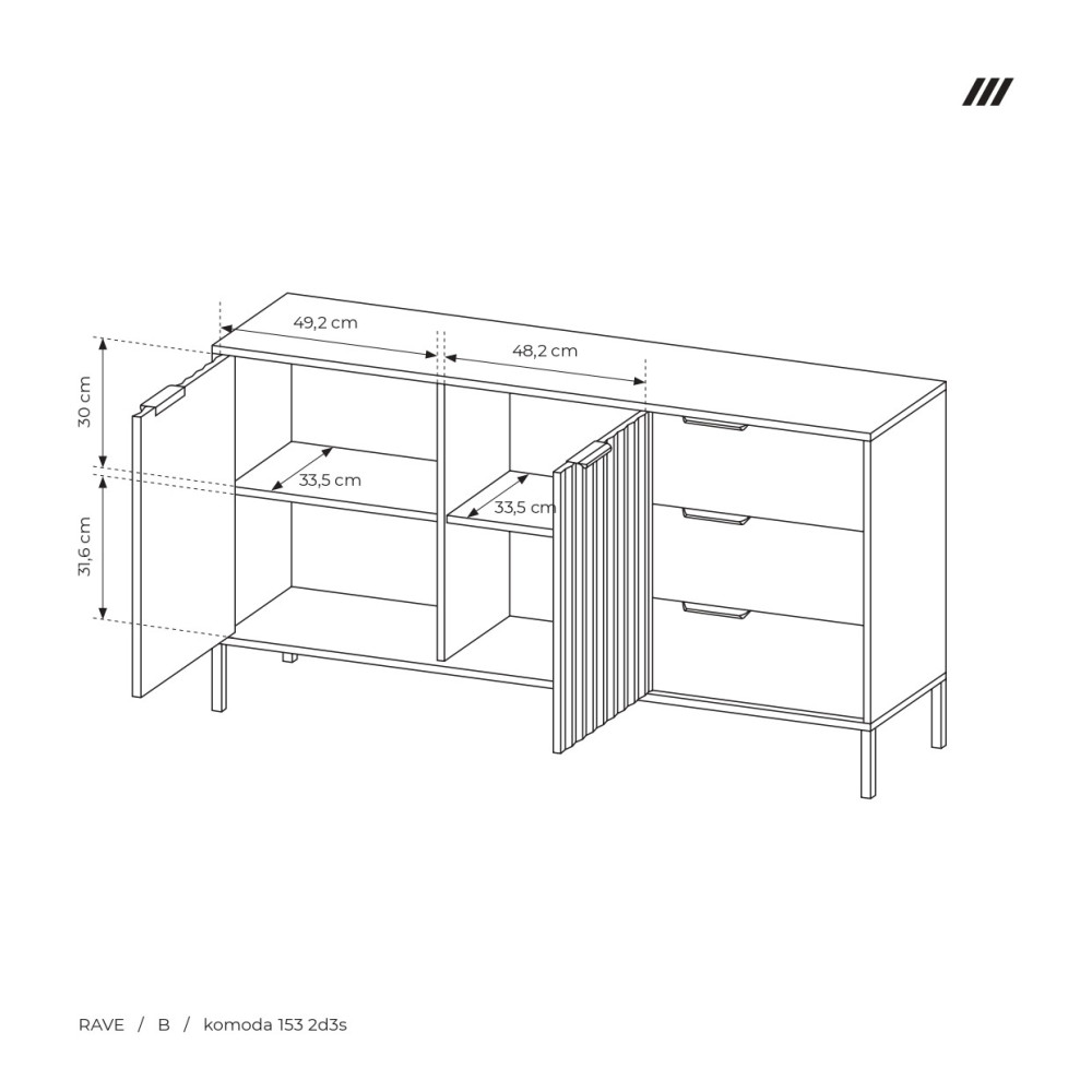 Komoda jest wyposażona w trzy pojemne szuflady i dwie szafki, które zapewniają dużo miejsca do przechowywania różnych przedmiotów. Szuflady wyposażone są w kulkowe prowadnice pełnego wysuwu, co ułatwia dostęp do ich zawartości. Dzięki temu komoda nie tylko prezentuje się stylowo, ale również oferuje funkcjonalność w codziennym użytkowaniu.
