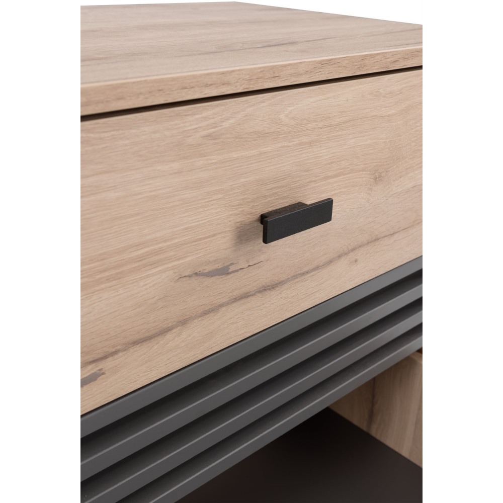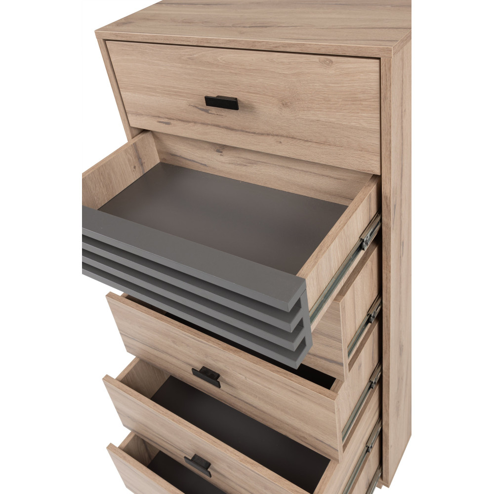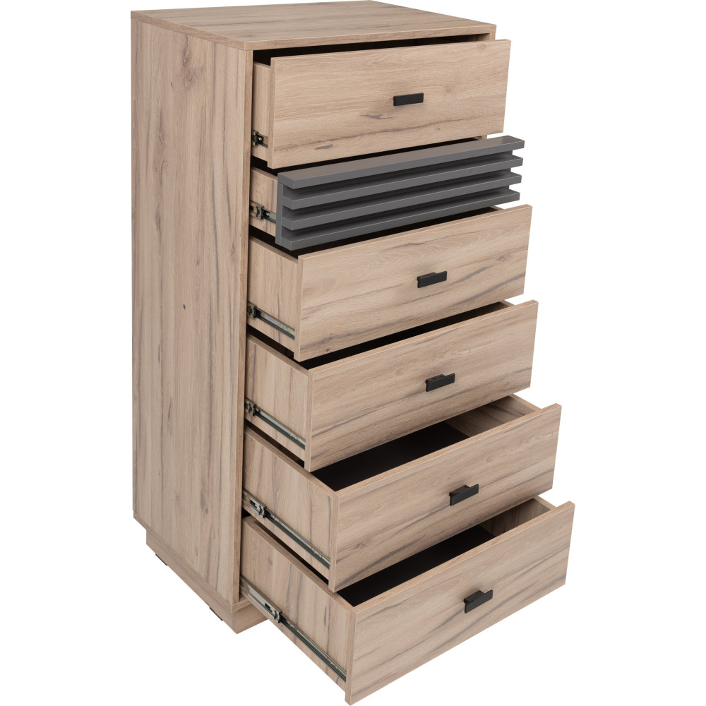 System meblowy Alikante to kompleksowy zestaw mebli, który cechuje się nowoczesnym designem oraz wysoką funkcjonalnością. Głównym materiałem używanym do produkcji tych mebli jest płyta laminowana o odcieniach kolorystycznych Dąb Estana Jasny oraz elegancki Antracyt.