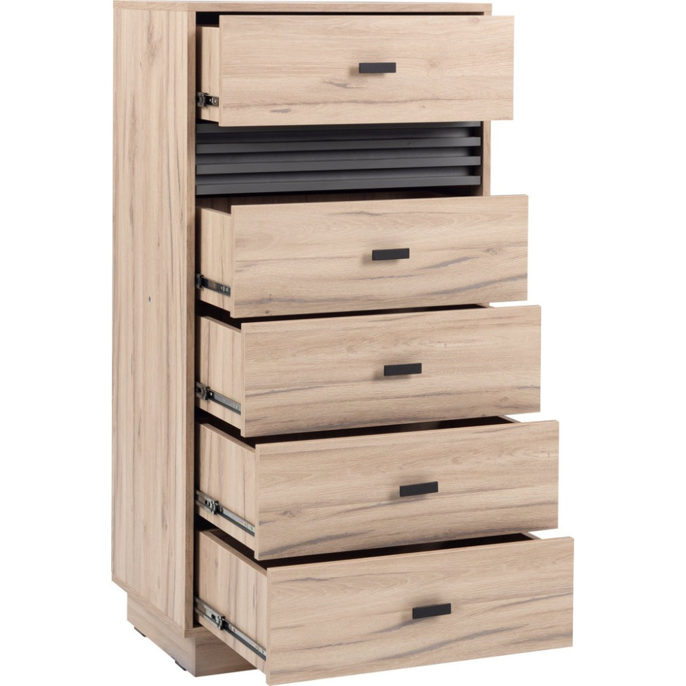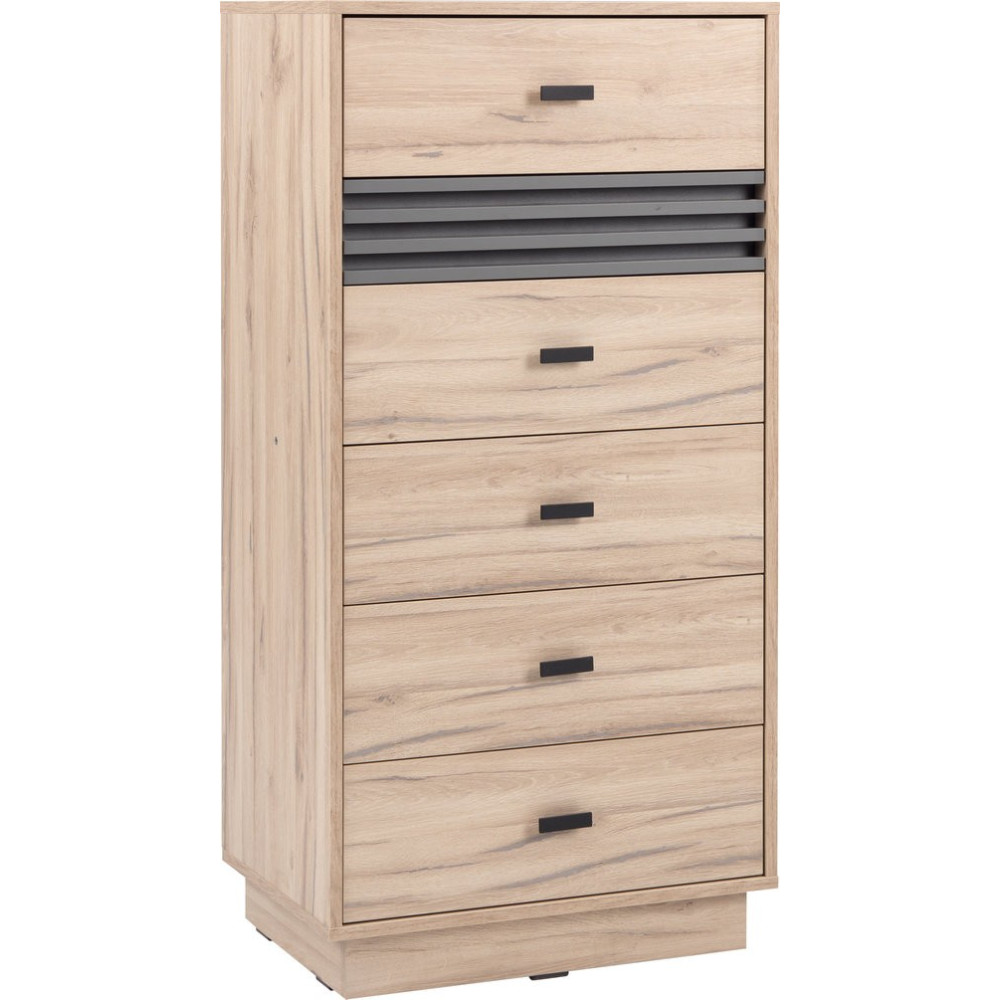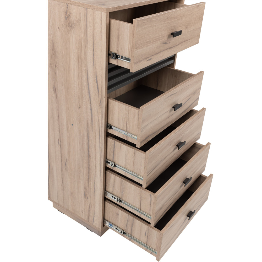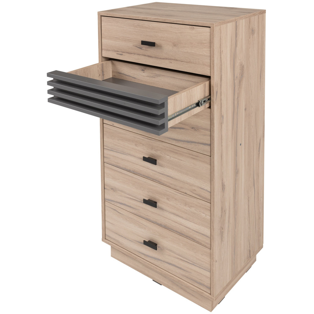 System meblowy Alikante to kompleksowy zestaw mebli, który cechuje się nowoczesnym designem oraz wysoką funkcjonalnością. Głównym materiałem używanym do produkcji tych mebli jest płyta laminowana o odcieniach kolorystycznych Dąb Estana Jasny oraz elegancki Antracyt.