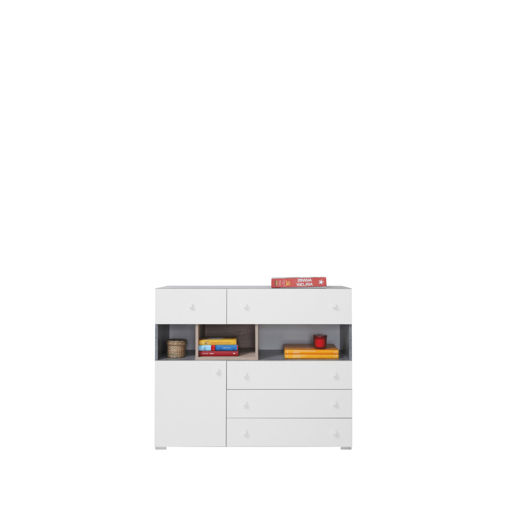 Komoda Sam 110 1D5SZ Biały Lux/Beton/Dąb