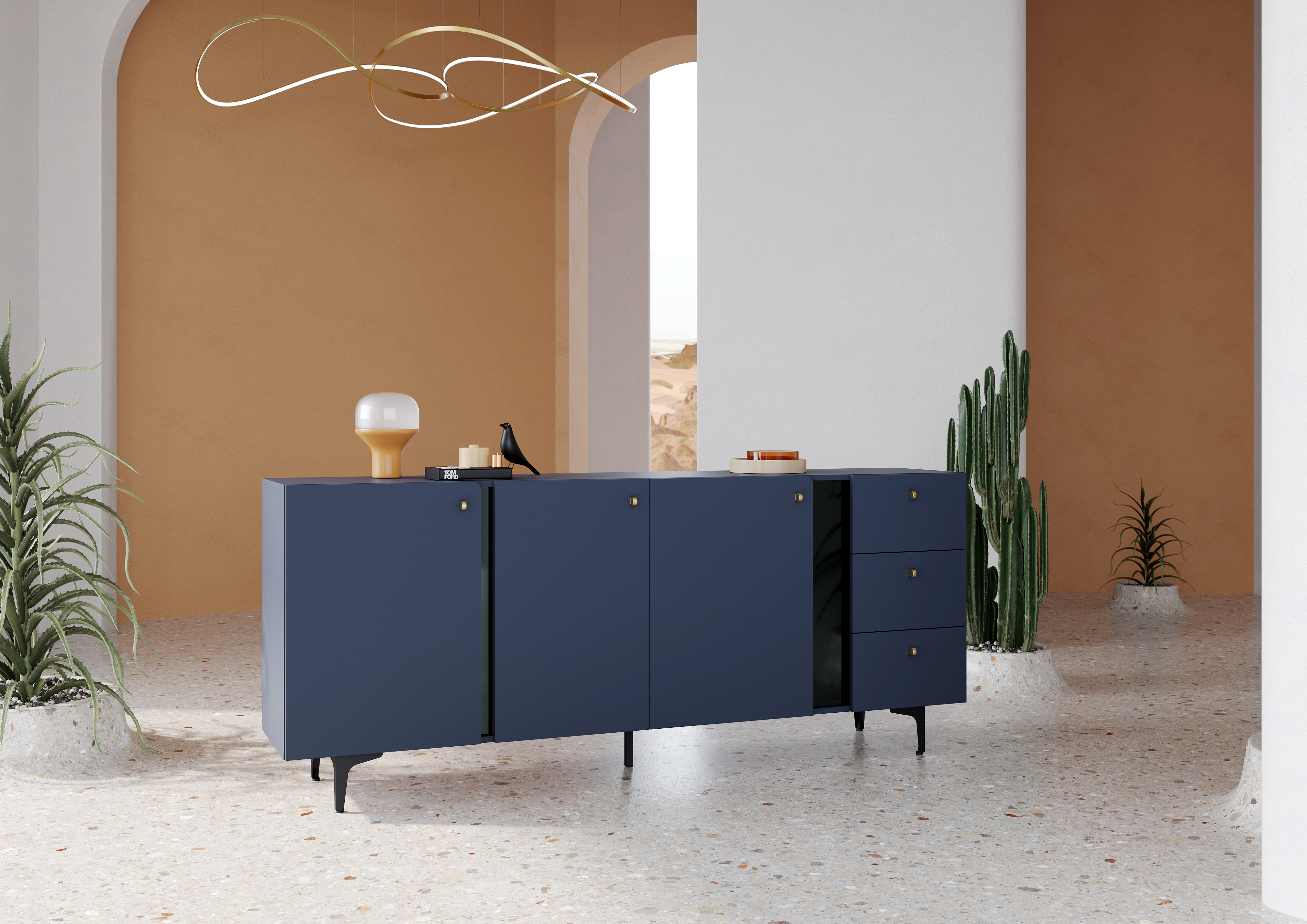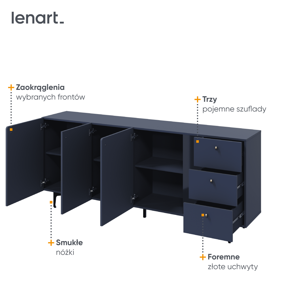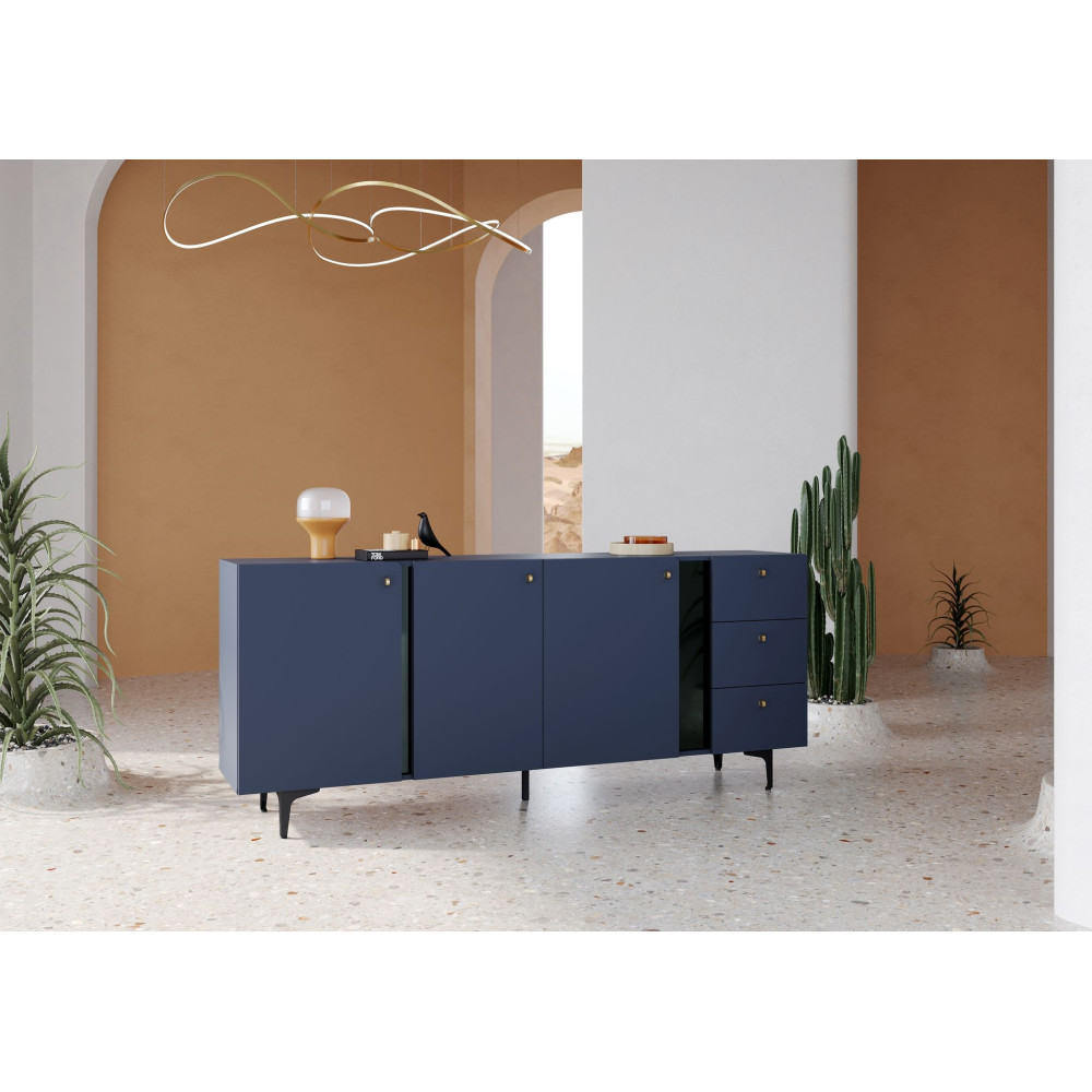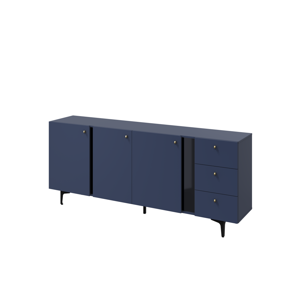 Wnętrze komody oferuje mnóstwo miejsca do przechowywania. Mebel wyróżnia się zdecydowaną kolorystyką – ciemny błękit w połączeniu z czarnymi detalami tworzy modny, nietypowy duet, który podkreśla efekt 3D na frontach. Charakterystyczne zaokrąglenia wybranych frontów dodają komodzie oryginalnego stylu, a złote, zgrabne uchwyty i smukłe nóżki nadają bryle lekkości. Drzwi wyposażono w system soft close dla komfortu użytkowania.