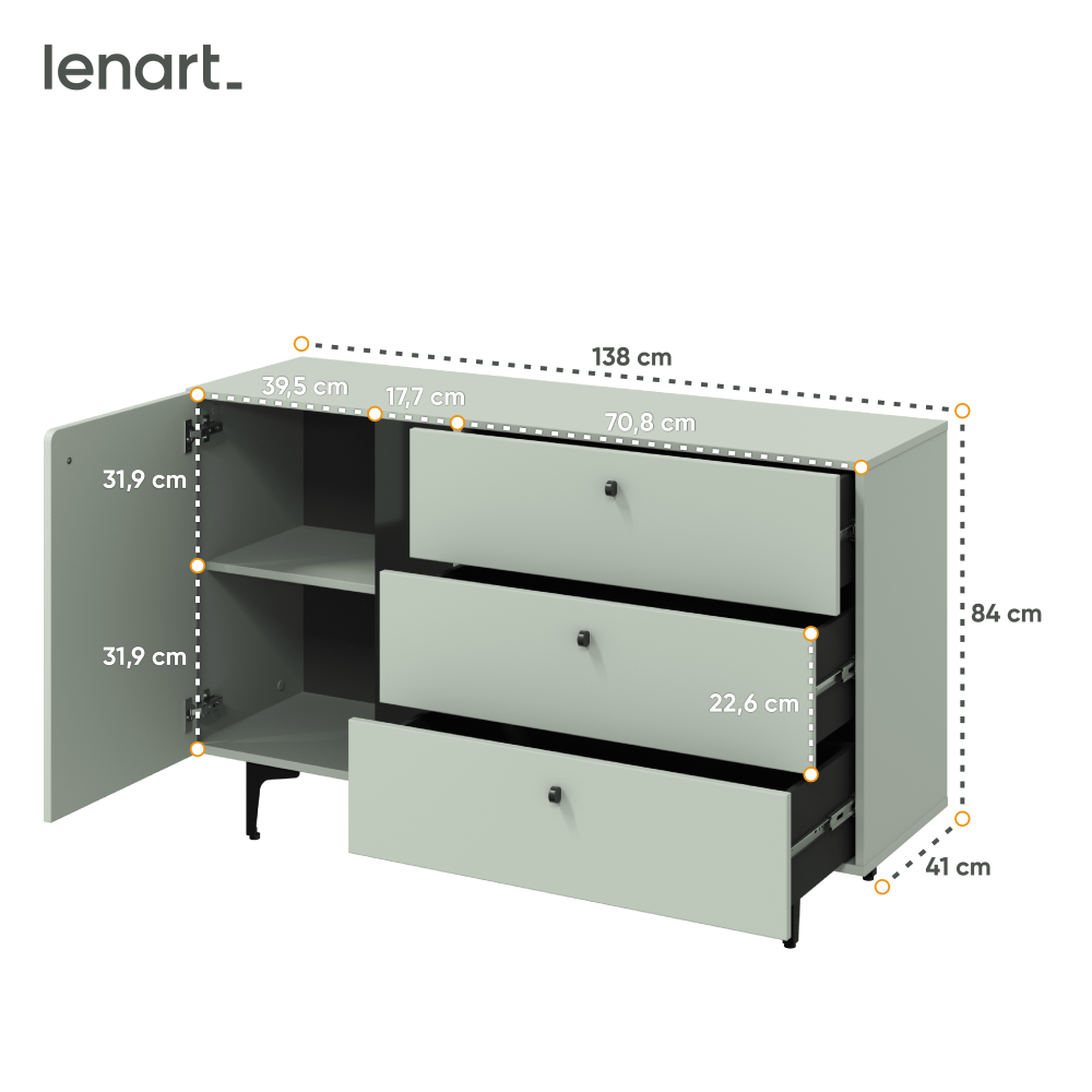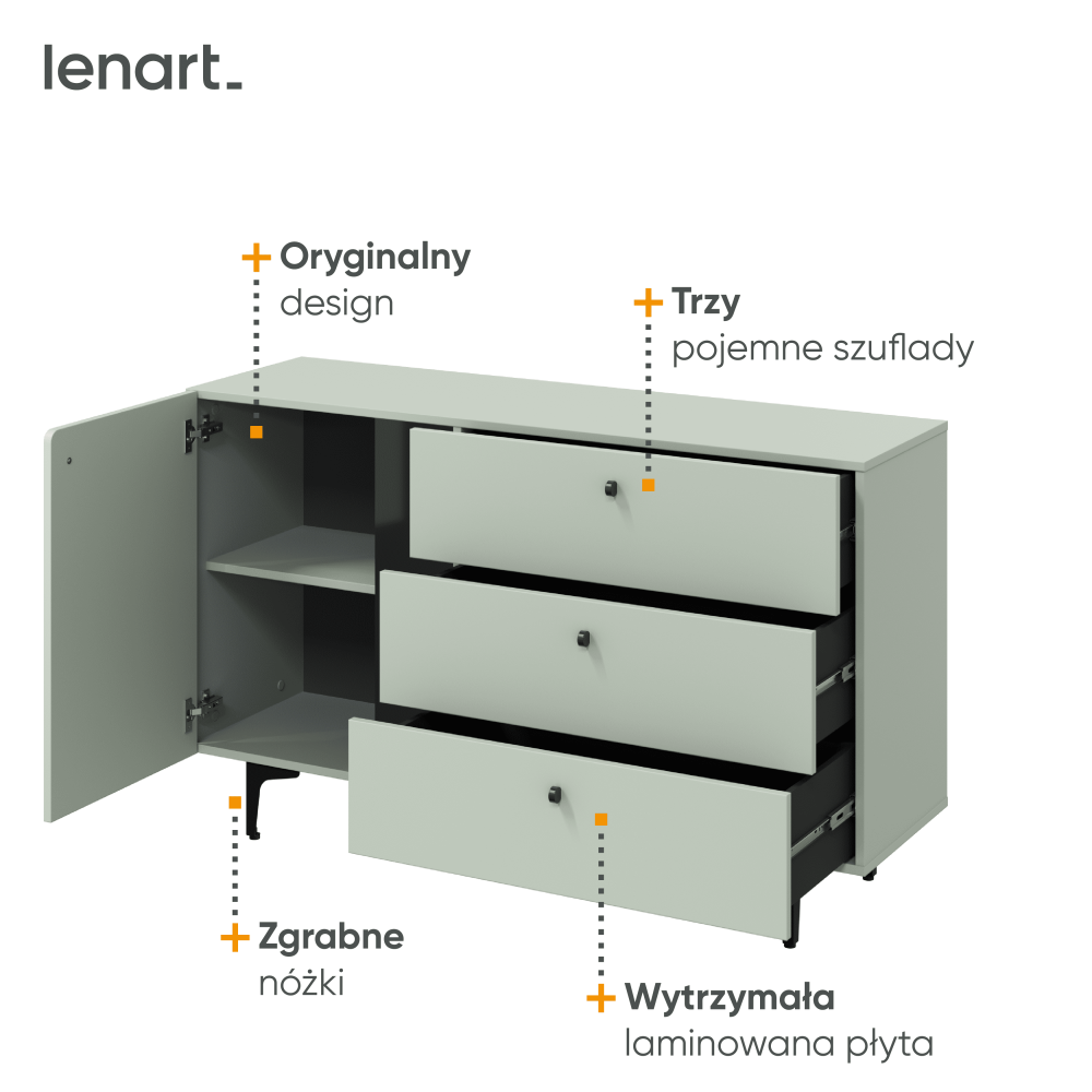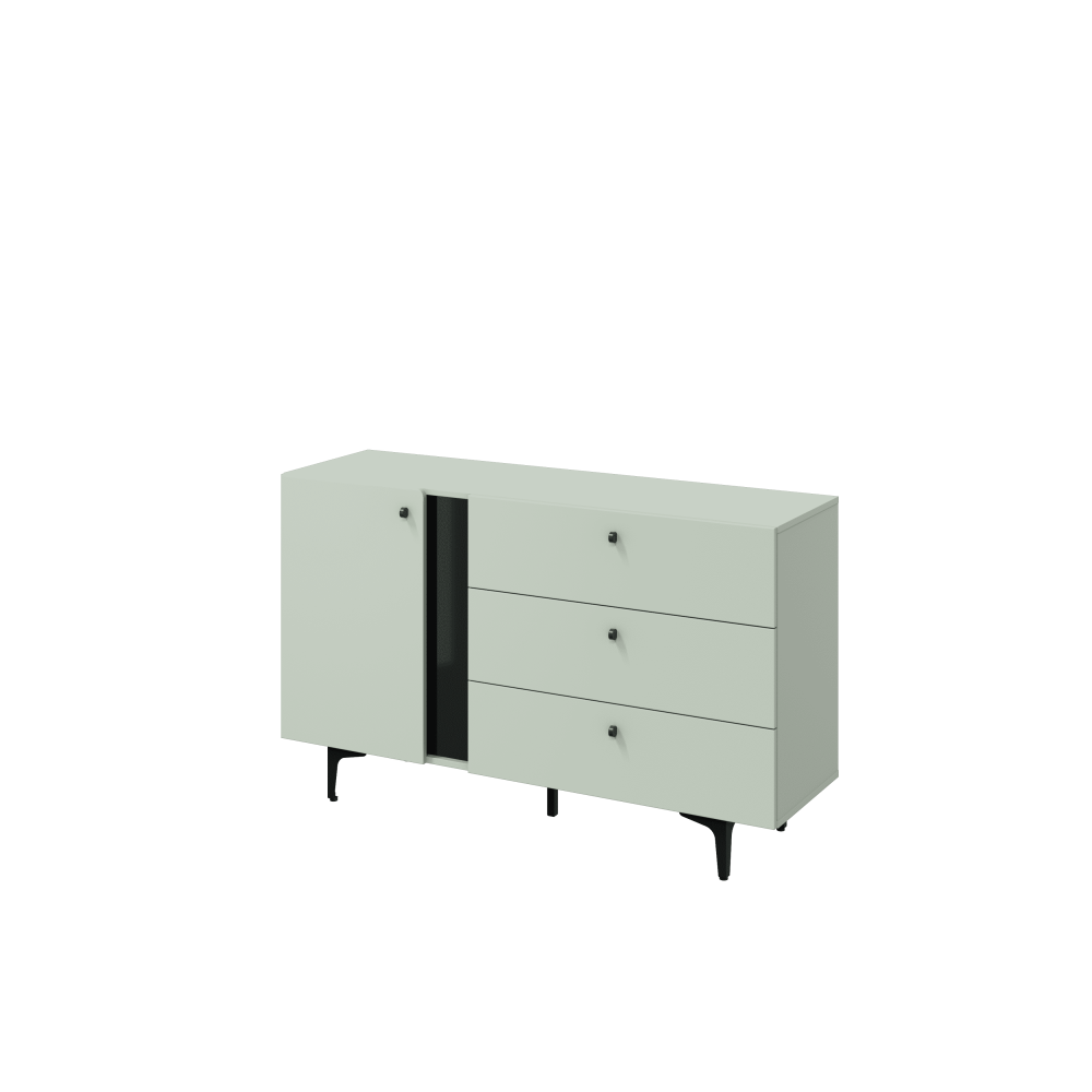 Komoda została wykonana z wytrzymałej płyty laminowanej, z obrzeżami wykończonymi ABS, co gwarantuje trwałość. Wyposażona w system soft close, zapewnia komfortowe i ciche zamykanie drzwi. Posiada trzy pojemne szuflady oraz szafkę z drzwiami. Dzięki klasycznej funkcjonalności komoda sprawdzi się w różnych pomieszczeniach – od salonu i sypialni, po garderobę, przedpokój czy małe mieszkanie typu studio.