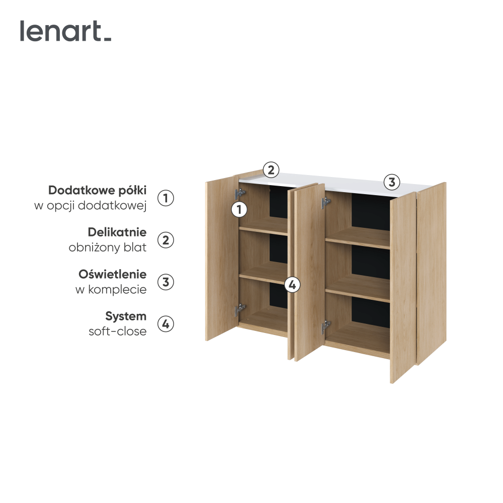 Komoda to nowoczesny i elegancki mebel, który świetnie uzupełni każde wnętrze. Łączy w sobie styl i funkcjonalność. Dzięki wbudowanemu oświetleniu LED tworzy przytulną atmosferę, a gładka powierzchnia w kolorze dąb scandi zachwyca wyglądem. Posiada system soft-close, a możliwość rozbudowy o dodatkowe półki czyni ją jeszcze bardziej praktyczną.