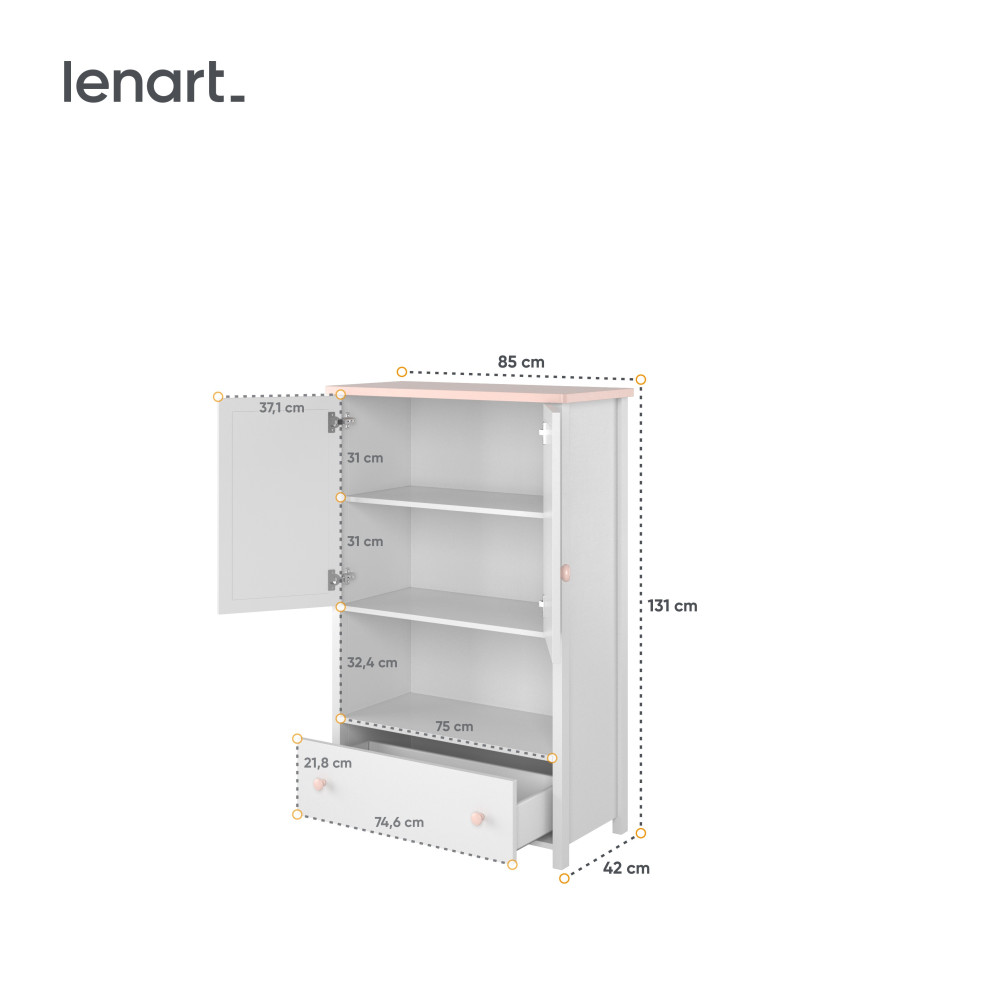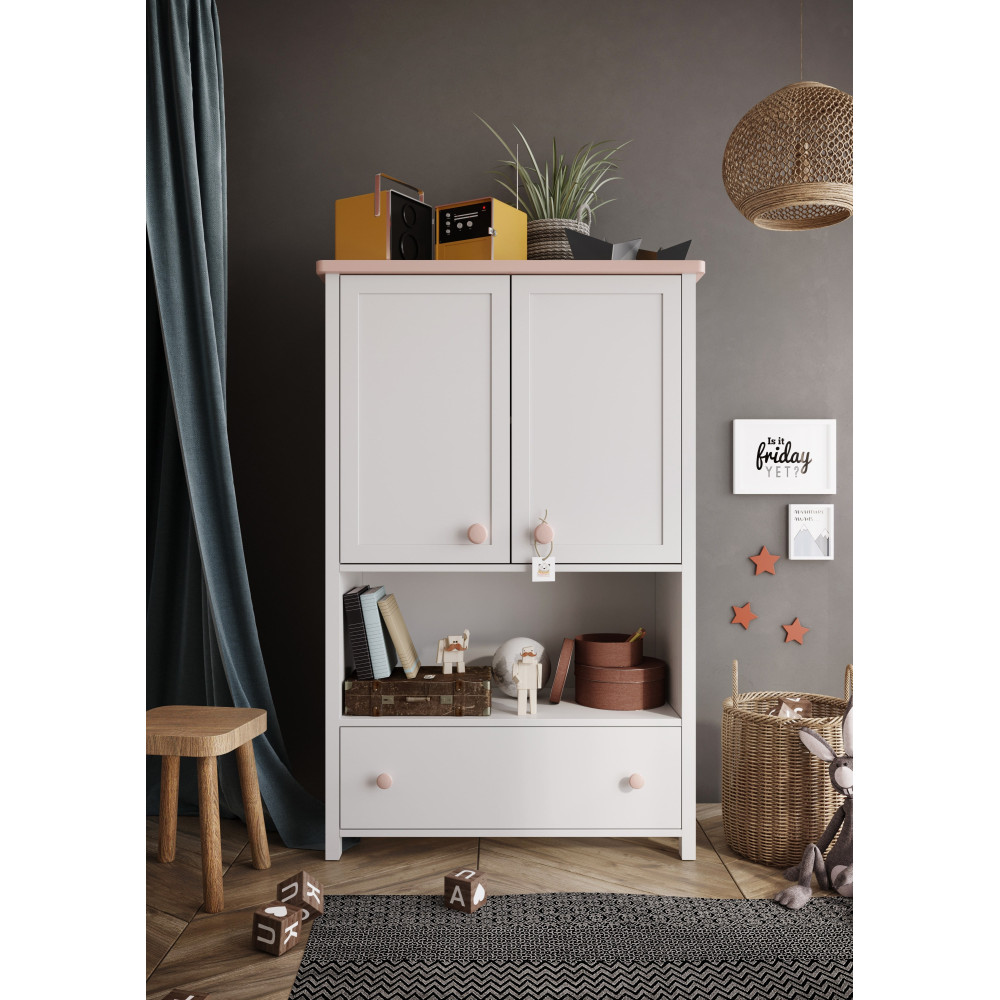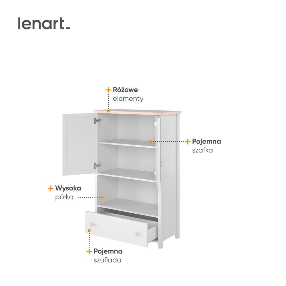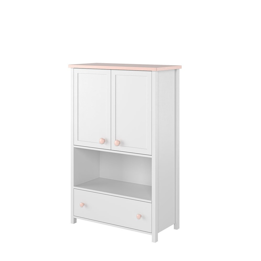 Komoda w białym kolorze z różowymi detalami to elegancki i praktyczny mebel, idealny do sypialni lub pokoju dziecięcego. Wyposażona w otwartą półkę, doskonałą na dekoracje lub przybory szkolne, oraz głęboką szufladę, zapewnia wygodną przestrzeń do przechowywania. Dwie pojemne szafki, ukryte za drzwiczkami, pomieszczą większe przedmioty, a subtelne różowe akcenty dodają meblowi uroku i lekkości. Idealna dla osób ceniących styl i funkcjonalność.