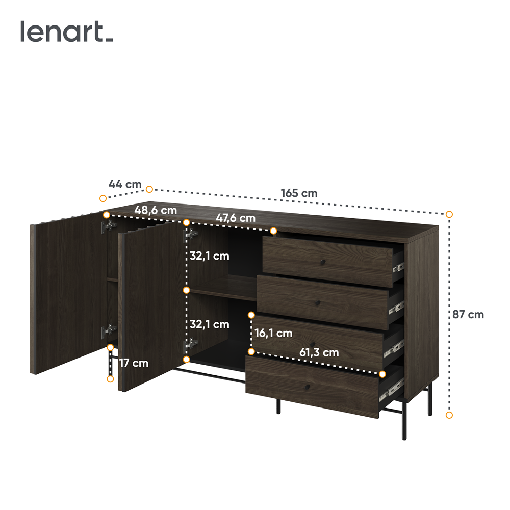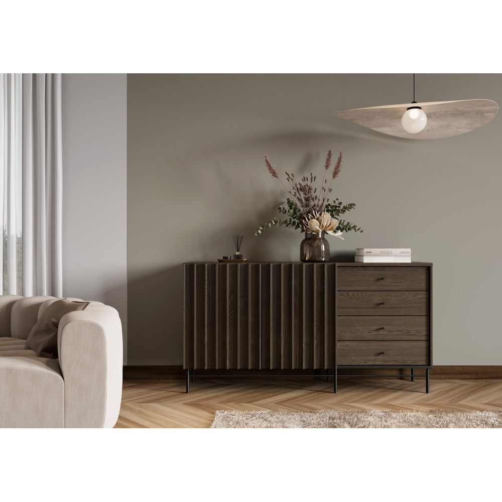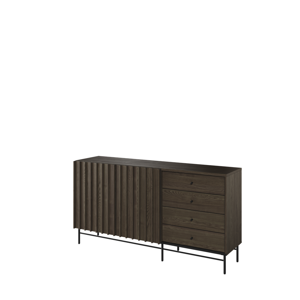 Komoda z 4 szufladami i 2 szafkami ukrytymi za drzwiami to idealne rozwiązanie dla osób ceniących sobie praktyczność i estetykę. Jej przestronność umożliwia zorganizowanie różnych przedmiotów, co sprawia, że doskonale odnajdzie się zarówno w nowoczesnej sypialni, jak i eleganckim salonie. Charakteryzuje się minimalistycznym designem, który podkreśla jej elegancję i dodaje wnętrzu wyjątkowego charakteru. Oryginalne zestawienie koloru jesion Portland z czarnymi metalowymi akcentami tworzy harmonijną całość. Smukłe lamele wprowadzają do przestrzeni subtelny rytm, czyniąc komodę nie tylko funkcjonalnym meblem, ale również atrakcyjną dekoracją każdego pomieszczenia.