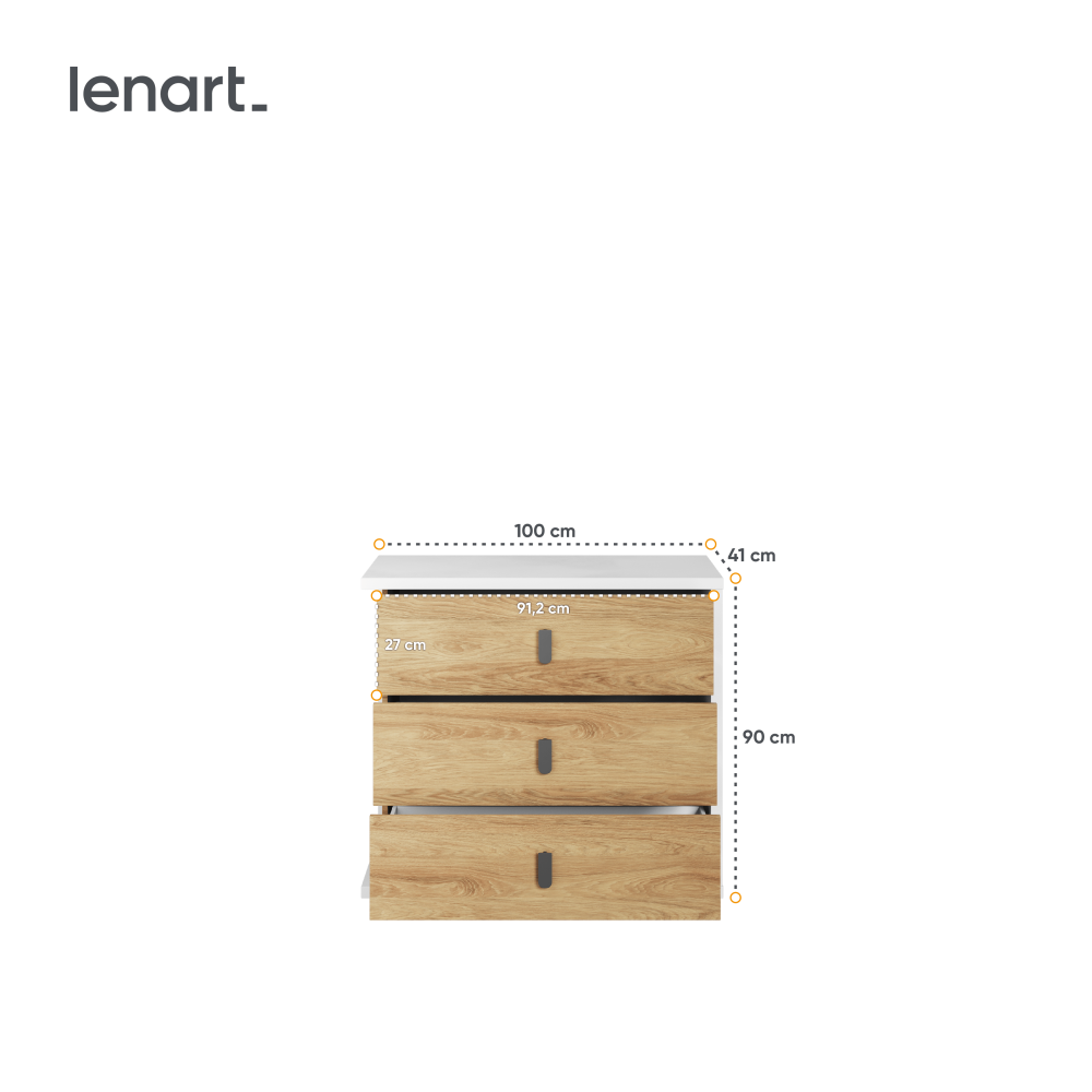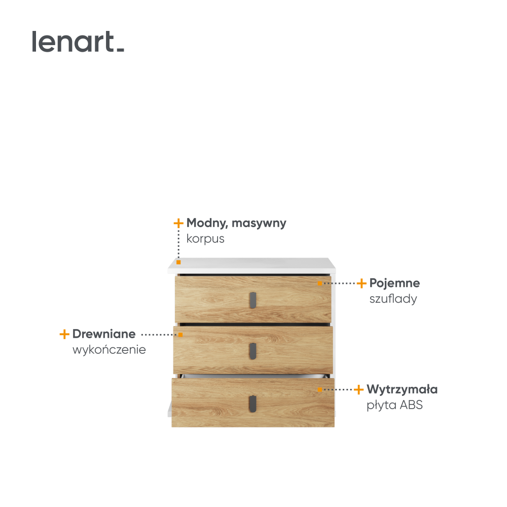 Stylowa komoda, która łączy funkcjonalność z nowoczesnym stylem. Wyposażona w trzy pojemne szuflady, zapewnia wygodne miejsce do przechowywania odzieży, akcesoriów i drobiazgów, co ułatwia utrzymanie porządku w każdym wnętrzu.