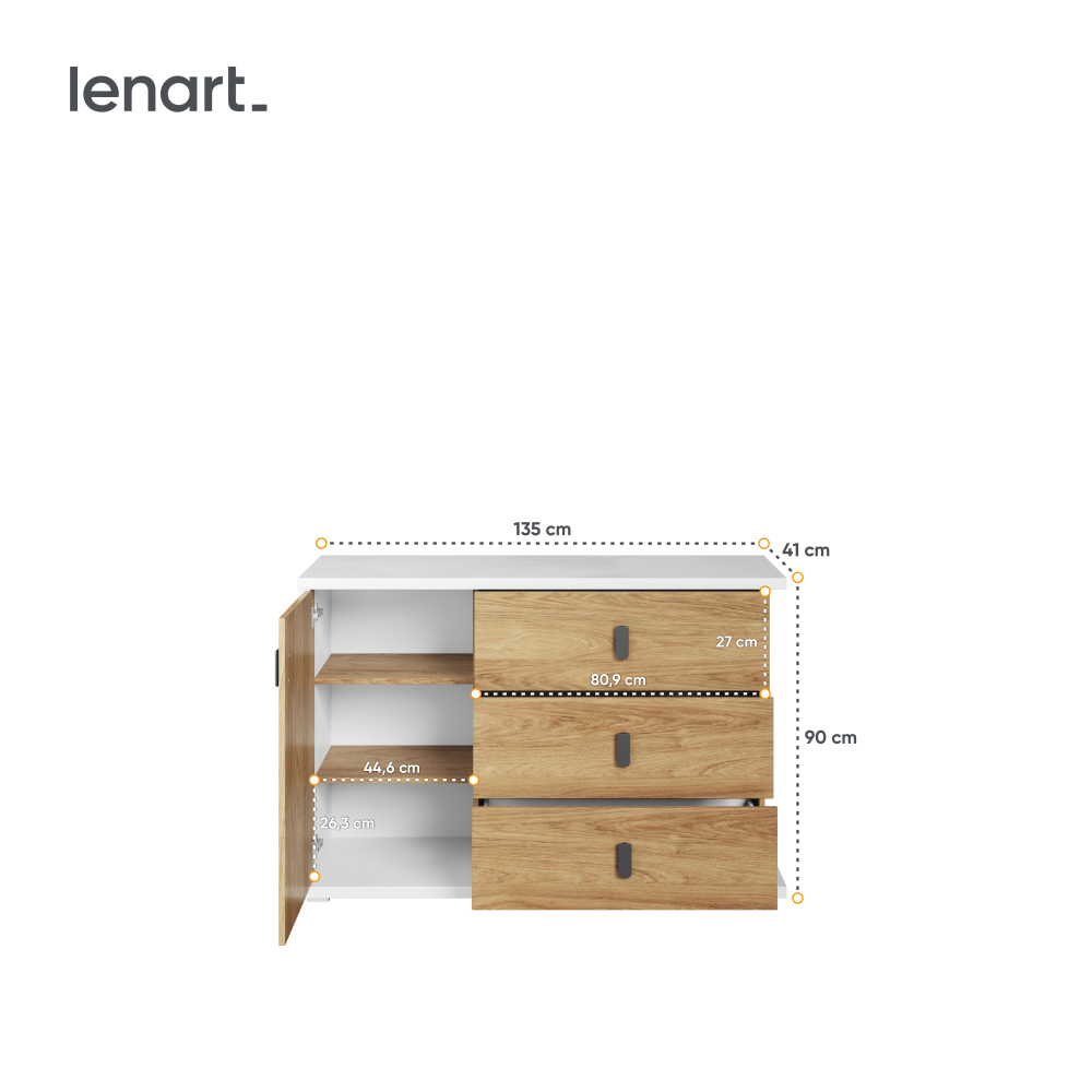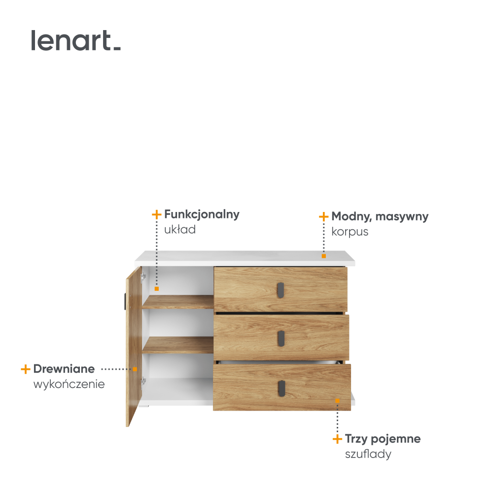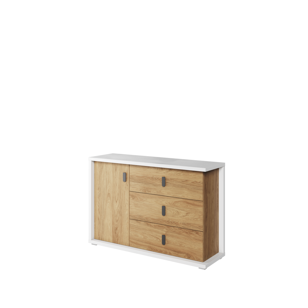 Stylowa komoda, która łączy funkcjonalność z nowoczesnym stylem. Wyposażona w trzy pojemne szuflady oraz półki ukryte za drzwiami, zapewnia wygodne miejsce do przechowywania odzieży, akcesoriów i drobiazgów, co ułatwia utrzymanie porządku w każdym wnętrzu.
