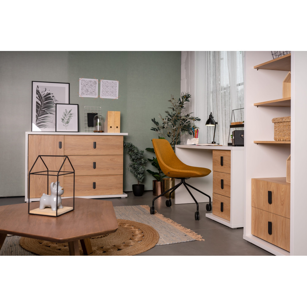 Ponadczasowe zestawienie bieli z ciepłym odcieniem drewna hikora nadaje komodzie przytulny charakter, wprowadzając harmonię do przestrzeni. Starannie wykonane detale sprawiają, że komoda nie tylko spełnia swoje funkcje, ale także staje się stylowym akcentem, który wzbogaca aranżację każdego pomieszczenia.