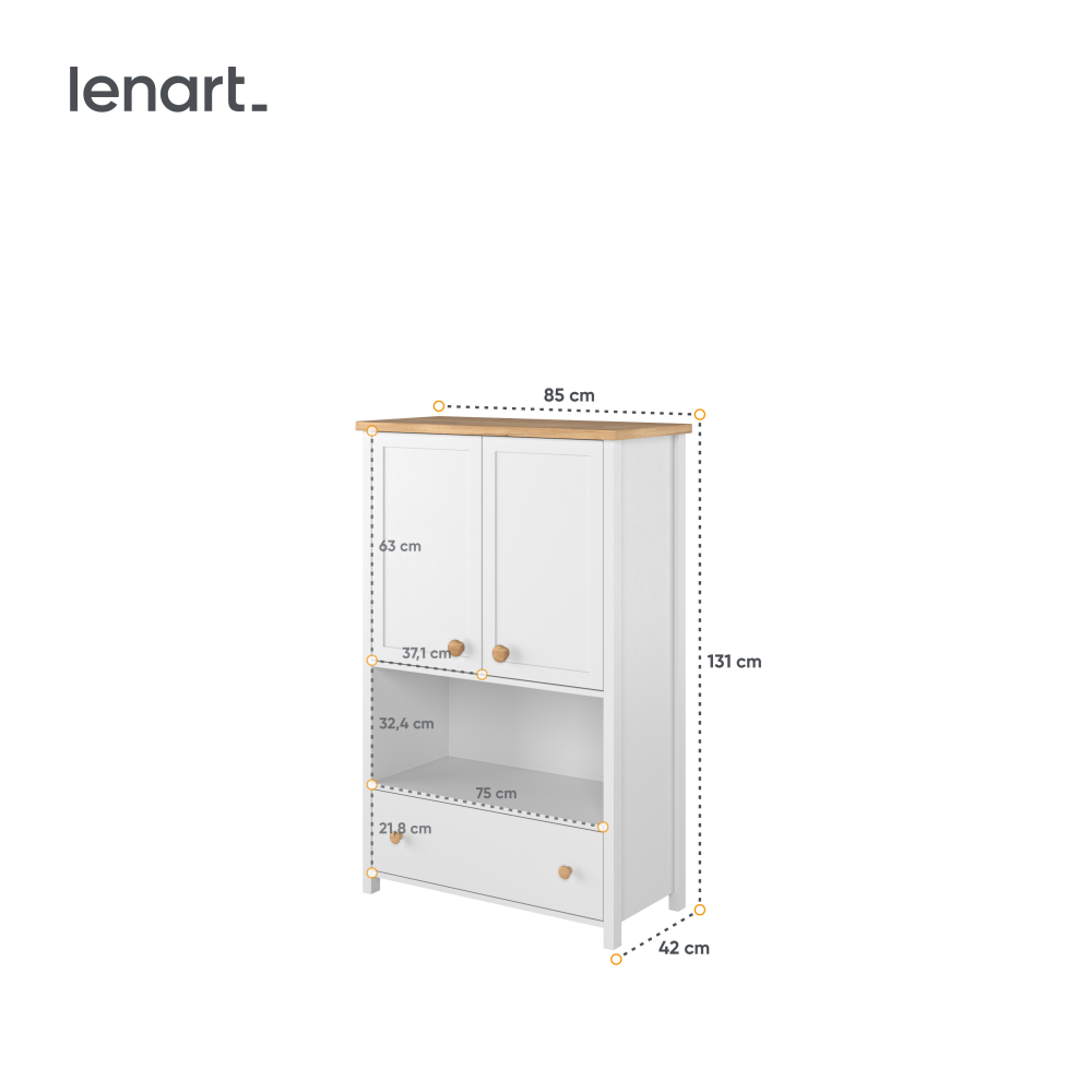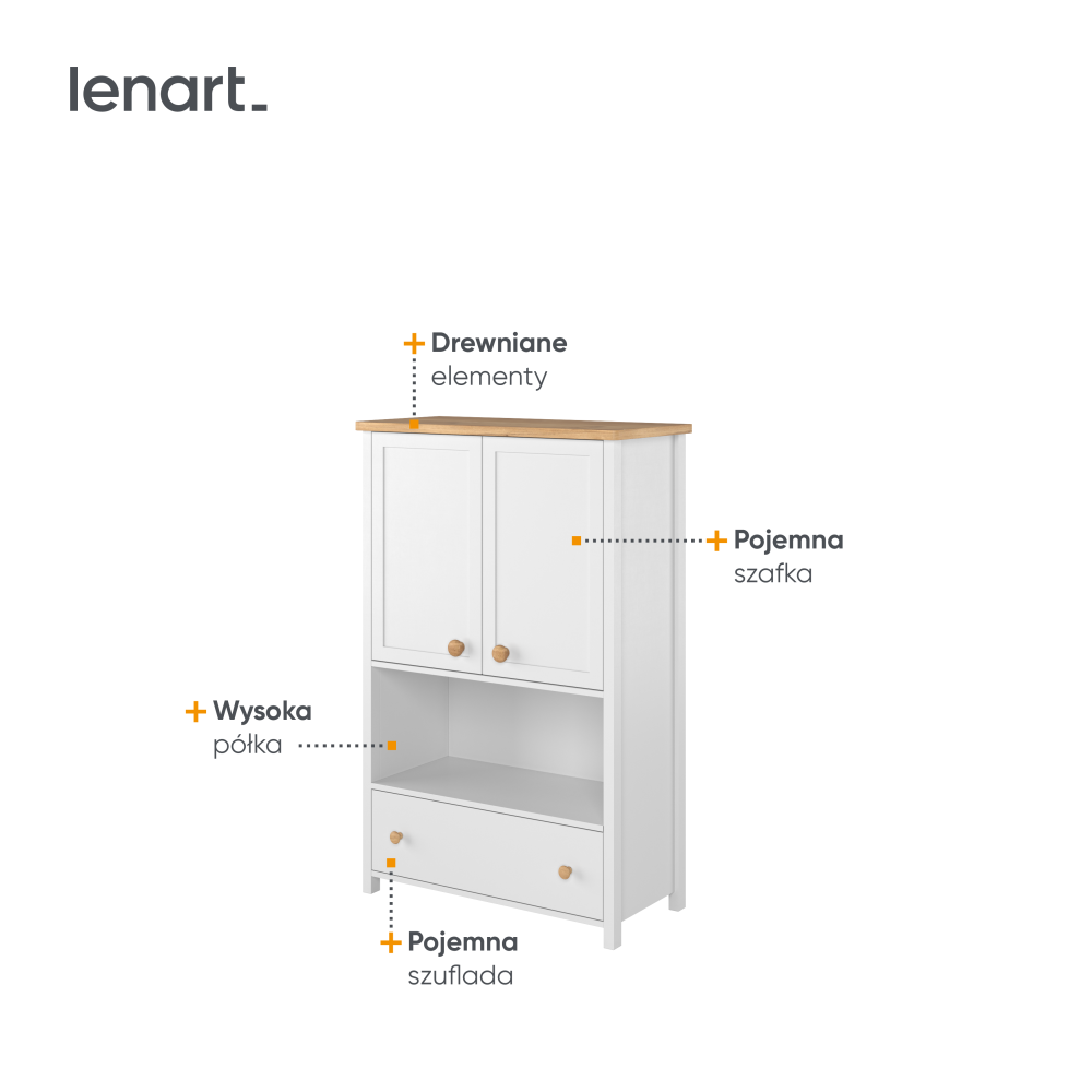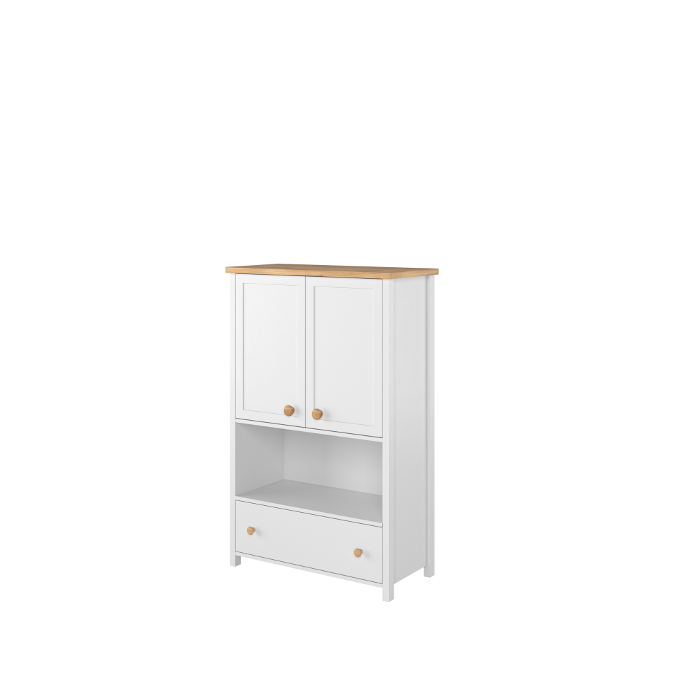 Stylowa komoda w kolorze białym z eleganckimi detalami w odcieniu dąb Nash, to idealne rozwiązanie do przechowywania różnych przedmiotów w każdym wnętrzu. Wyposażona w pojemną szufladę na dole, wysoką półkę oraz szafkę ukrytą za drzwiami oferuje mnóstwo miejsca na przechowywanie książek, dekoracji czy innych akcesoriów. Dzięki funkcjonalnemu układowi i nowoczesnemu designowi, komoda doskonale sprawdzi się zarówno w pokoju dziecięcym, jak i młodzieżowym, łącząc estetykę z praktycznością w codziennym użytkowaniu.
