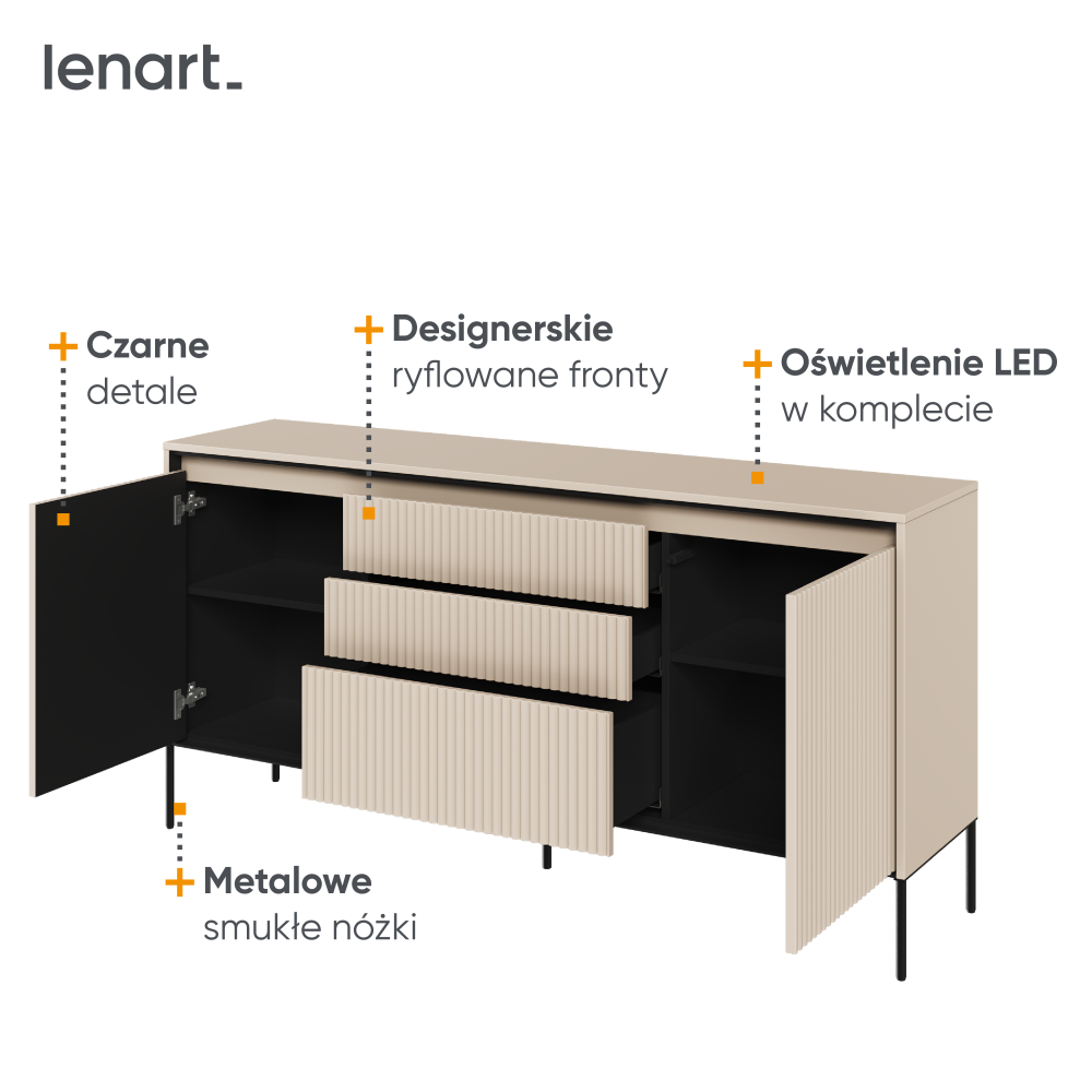Beżowa komoda posiada system PUSH-OPEN, metalowe nogi oraz trzy szuflady i dwie półki ukryte za drzwiami. Jej fronty ozdobiono ryflowaniem typu "półwałek", dodatkowo podkreślonym oświetleniem LED, które dodaje elegancji. Szeroki blat stanowi idealne miejsce na dekoracje, a wnętrze komody oferuje dużo przestrzeni do przechowywania. Całość wykonana z trwałych materiałów, łączy nowoczesny design z praktycznymi rozwiązaniami organizacyjnymi.