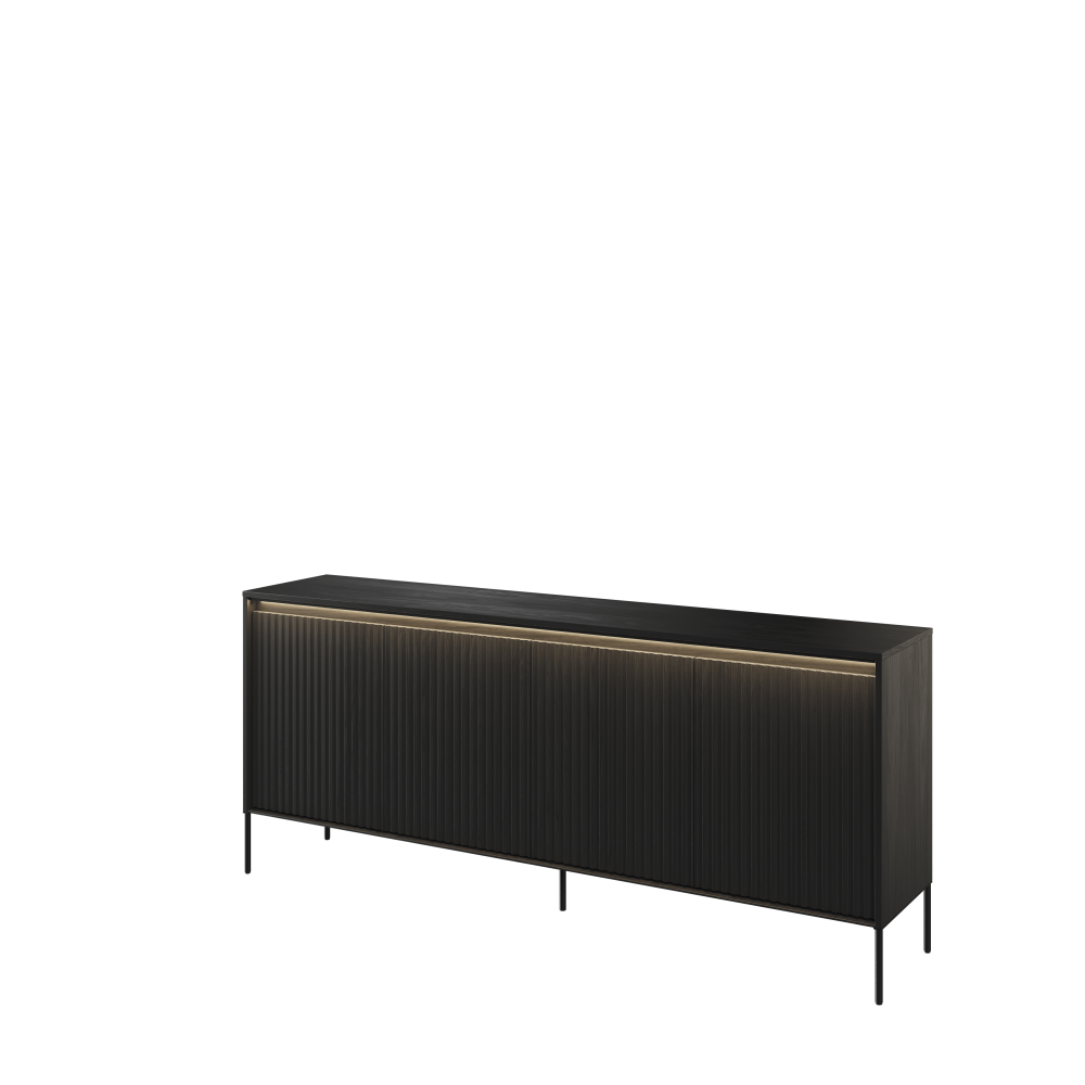 Czarna czterodrzwiowa komoda zachwyca oryginalnym wzorem ryflowanych frontów, które nadają meblowi unikalny i przyciągający wzrok wygląd. Zintegrowane oświetlenie LED dodatkowo podkreśla przestrzenność i elegancję komody, tworząc subtelny efekt świetlny, który dodaje wnętrzu charakteru.