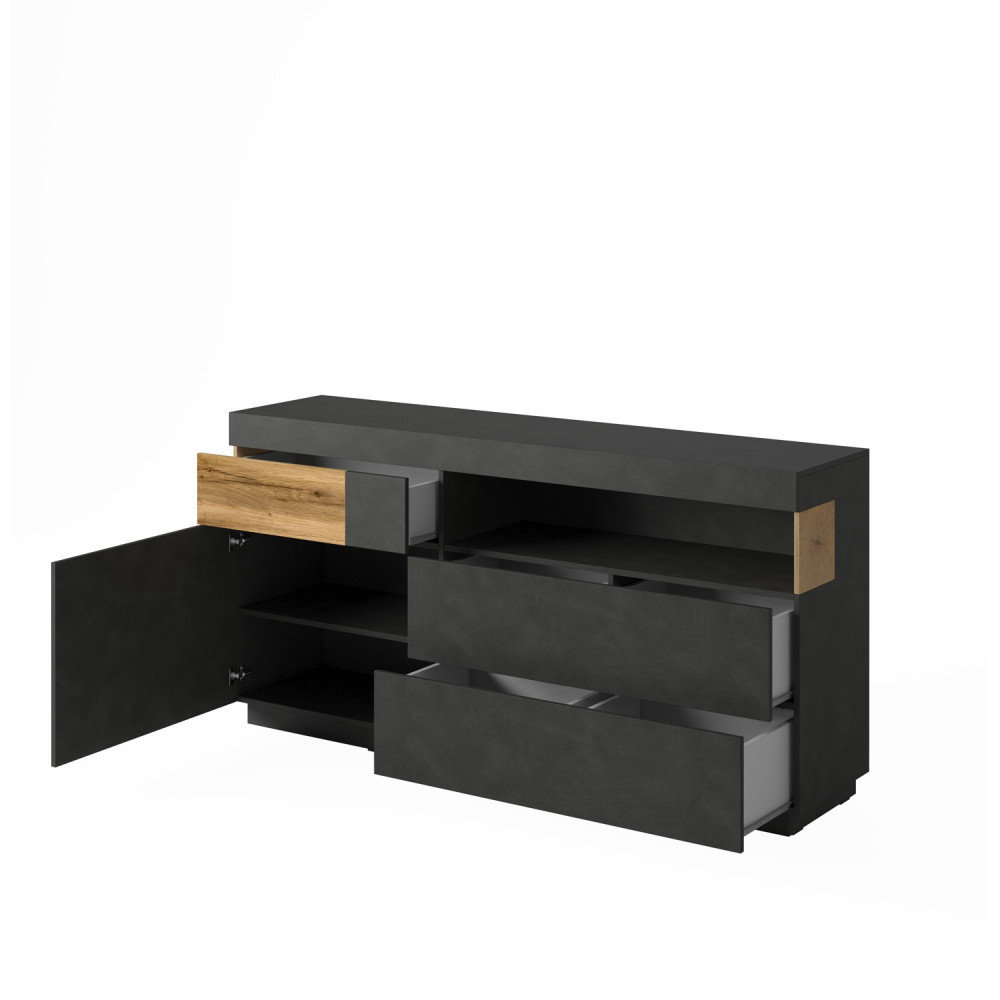 Uniwersalna komoda programu Keli która dzięki swoim gabarytom idealnie wkomponuje się zarówno w małe wnętrza jak i stanie się uzupełnieniem aranżacji w większych pomieszczeniach. Dzięki swojej konstrukcji może pełnić zarówno funkcję praktycznej komody służącej do przechowywania przeróżnych rzeczy jak i  może być wykorzystana jako wysoka szafka telewizyjna a  zawartą w niej otwartą wnękę  można użyć na sprzęt AV.