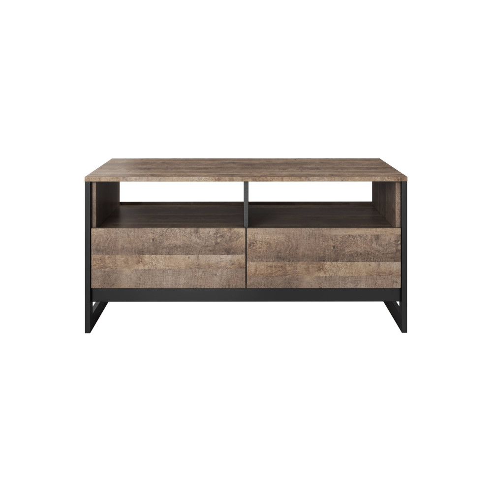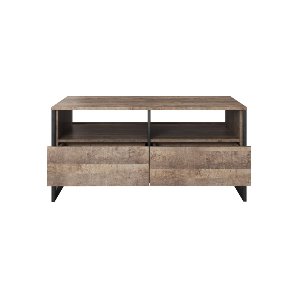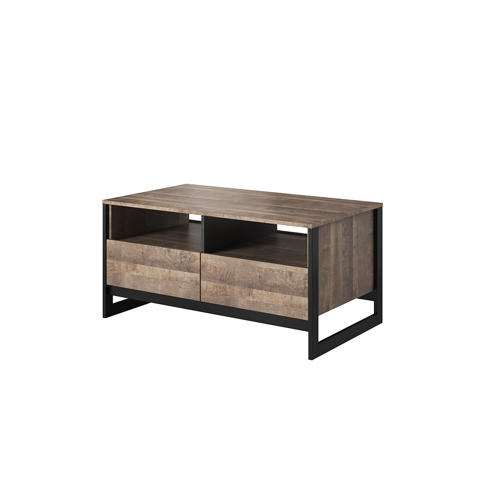 Arden to meble w oryginalnym industrialnym stylu. Połączenie dębu klepkowego z lekko porysowanym ciemnoszarym metalem nada wnętrzu niepowtarzalnego loftowego klimatu. Całość podkreślona została ramką z naturalnej sklejki w kolorze czarnym.
