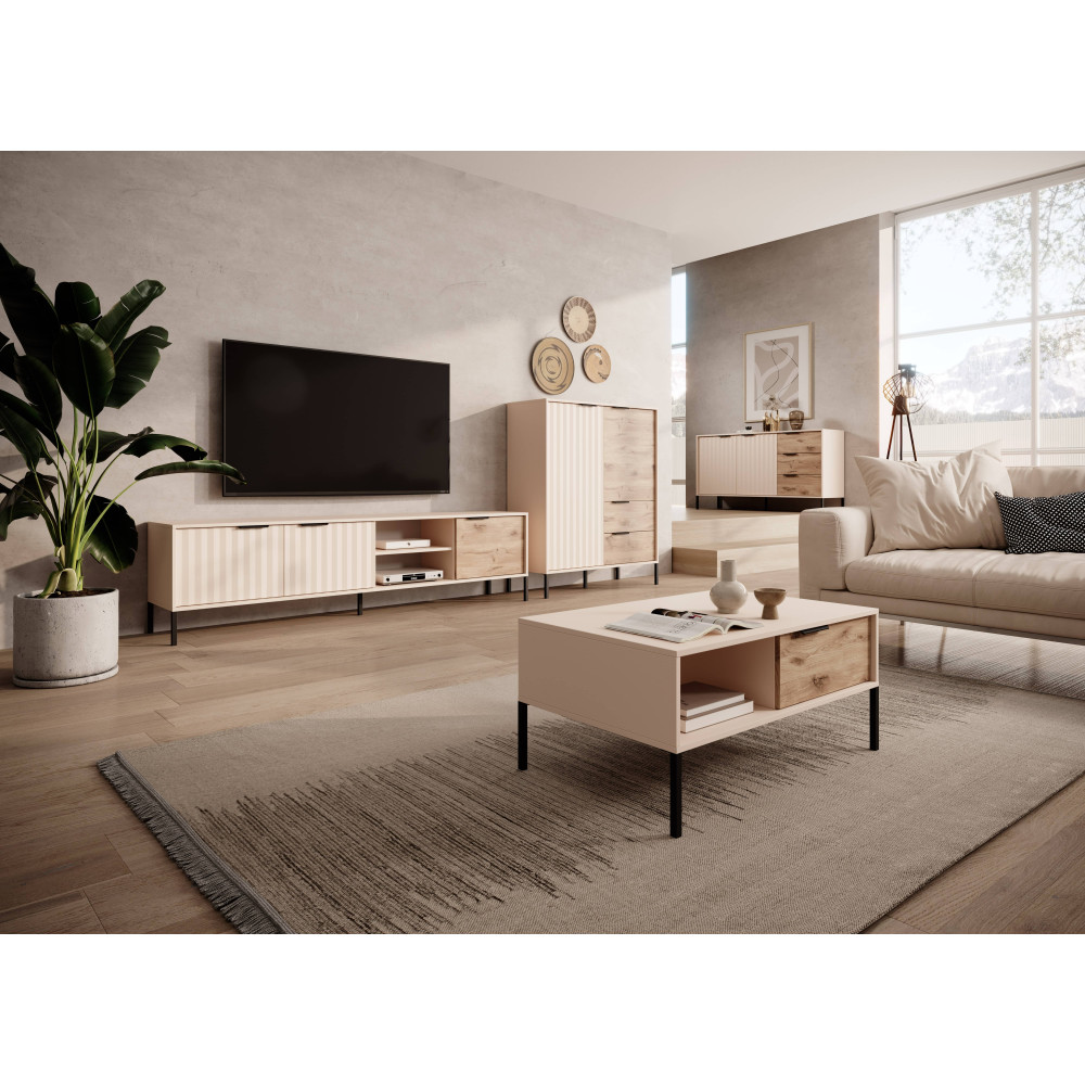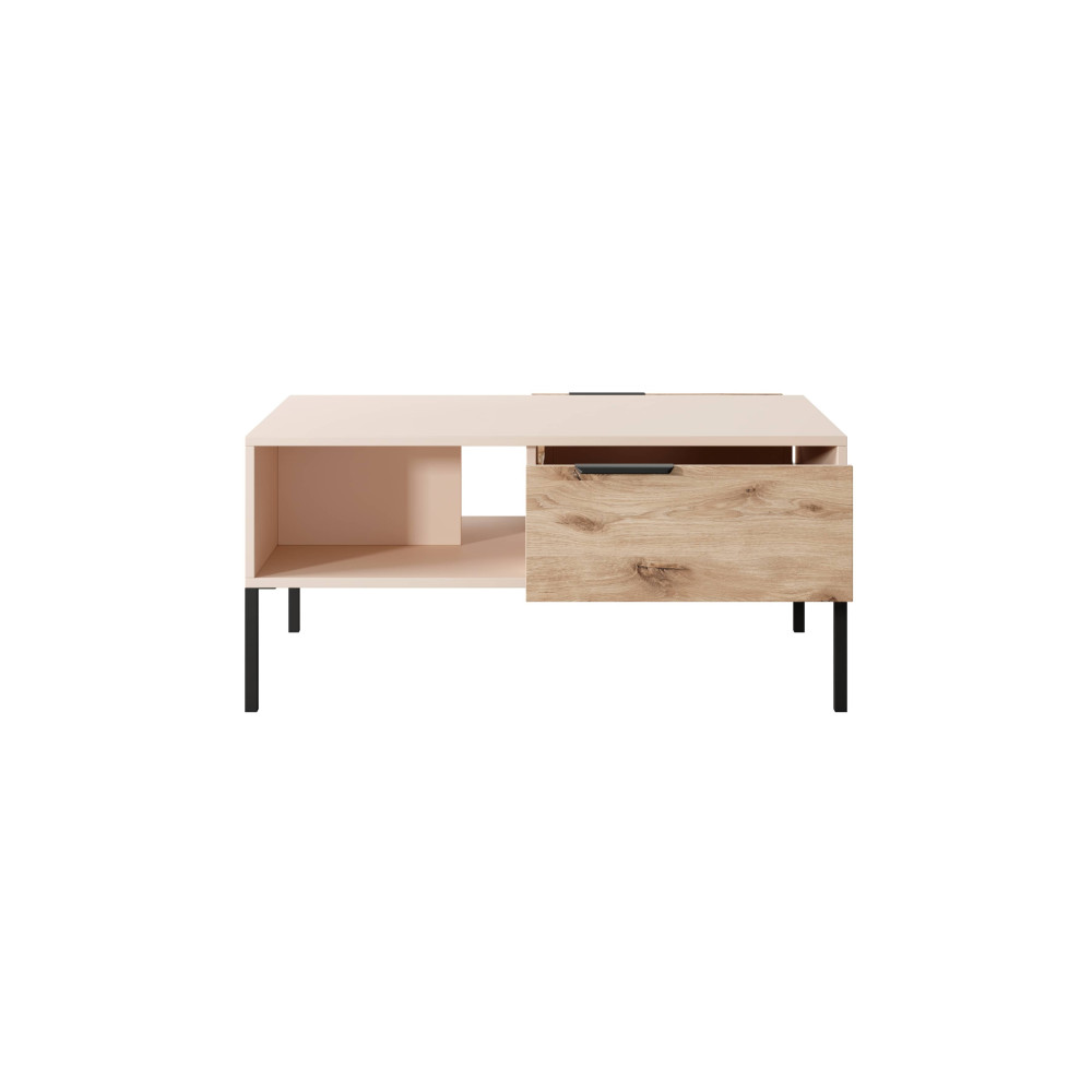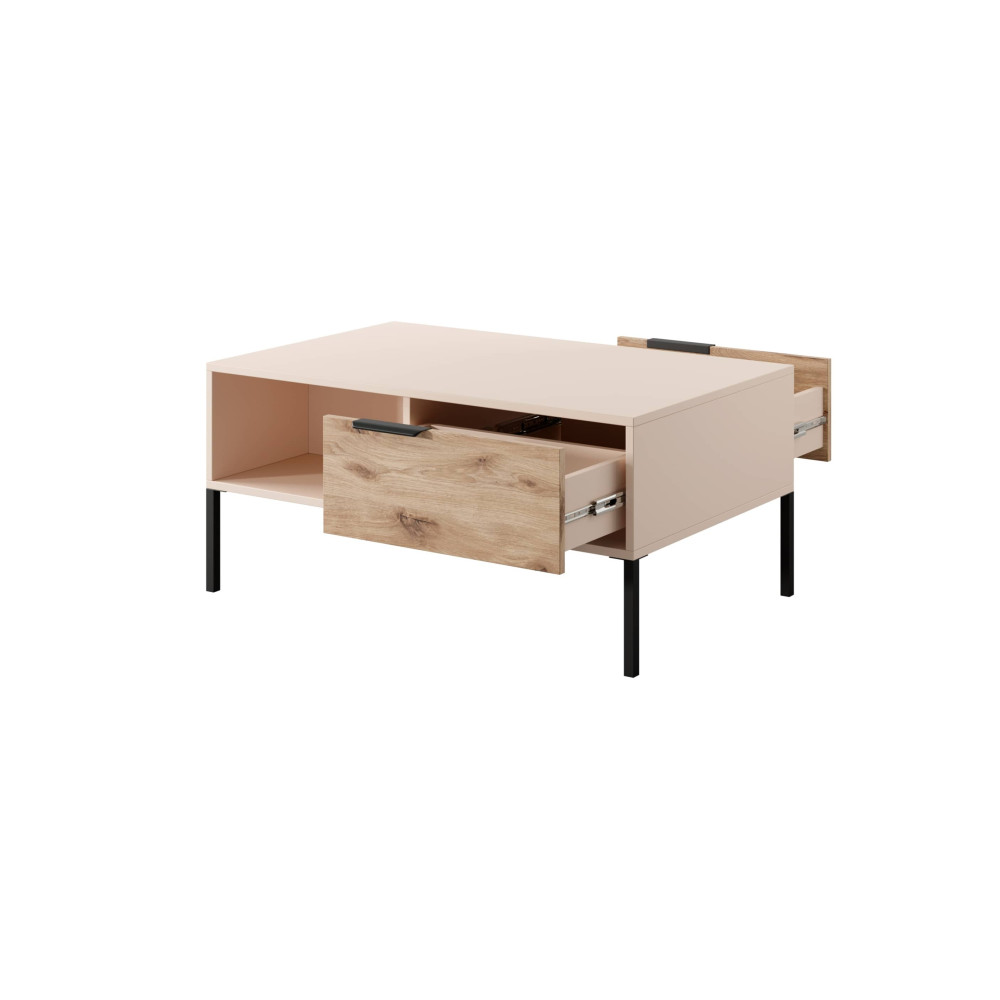 Blat stolika kawowego wykonany jest z płyty wiórowej laminowanej o grubości 16 mm w kolorze beżowym, co nadaje mu elegancji i uniwersalności. Dodatkowo, stolik posiada wykończenie dębu viking, które wprowadza ciepły i naturalny element do całej kompozycji.