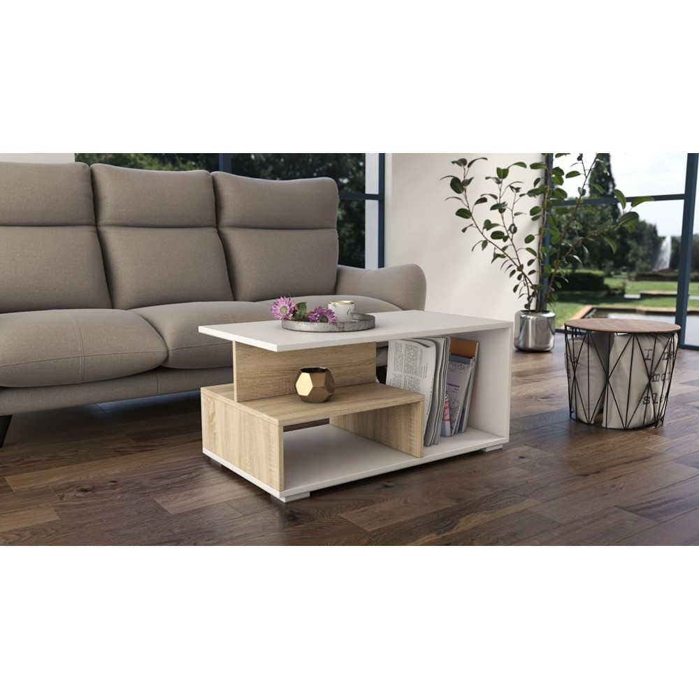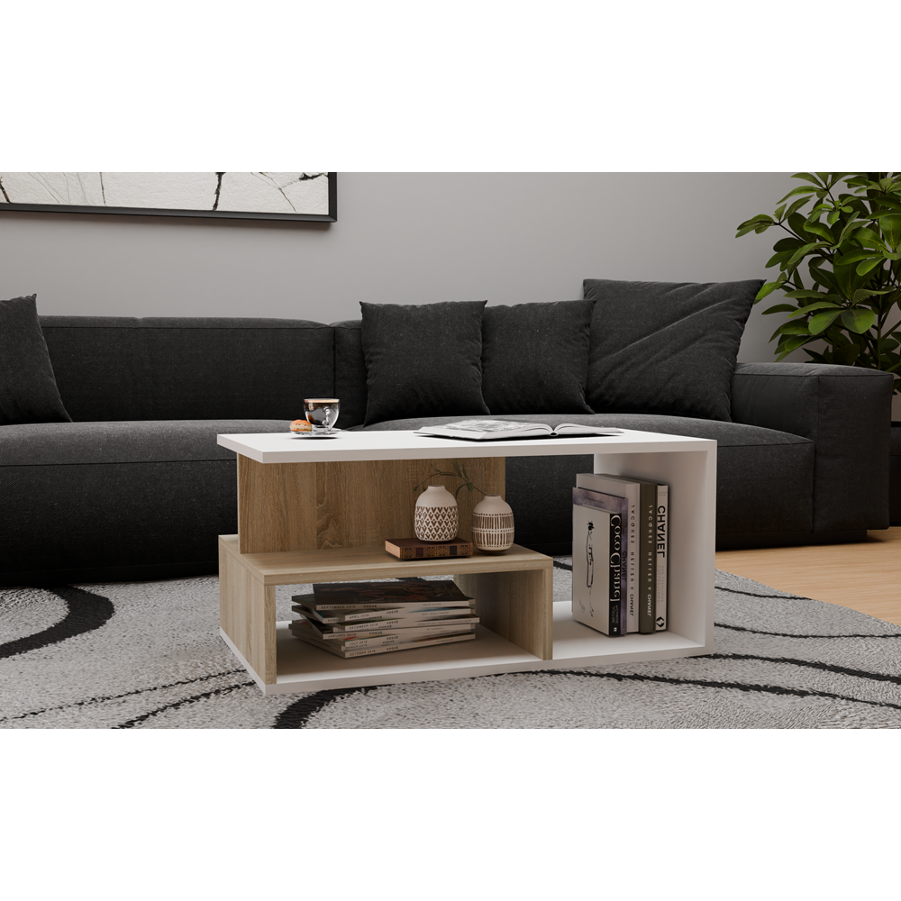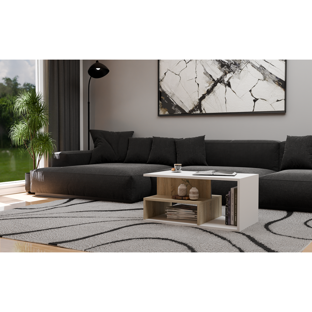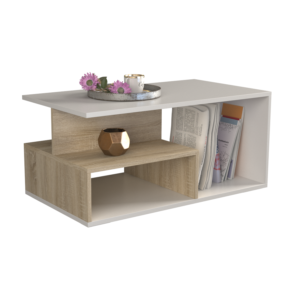 Ława kawowa wykonana z solidnej płyty laminowanej wraz z dodatkową półką na przedmioty codziennego użytku. Świetnie nadaje się do nowoczesnych salonów, mniejszych pokoi, czy eleganckich biur.
