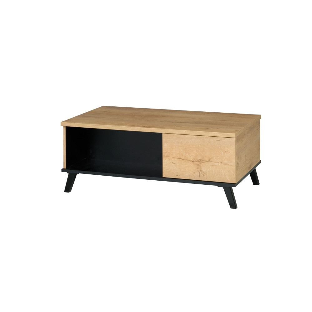 Tył stolika kawowego wykonany z płyty HDF dodatkowo wzmacnia konstrukcję mebla, zapewniając stabilność i trwałość. Podwyższone nóżki z kolei ułatwiają utrzymanie czystości pod stolikiem kawowym.