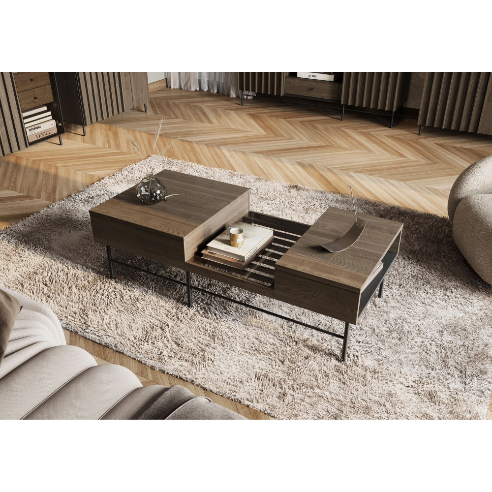 Stolik wyposażony jest w szufladę oraz półkę po przeciwnych stronach, co zapewnia wygodę przechowywania i organizacji. Jego geometryczna forma w połączeniu ze smukłymi metalowymi nóżkami i subtelnymi lamelami tworzy harmonijną całość. Dekor w kolorze jesion portland sprawia, że mebel doskonale wpisuje się w nowoczesne aranżacje, wnosząc do wnętrza elegancję i styl.