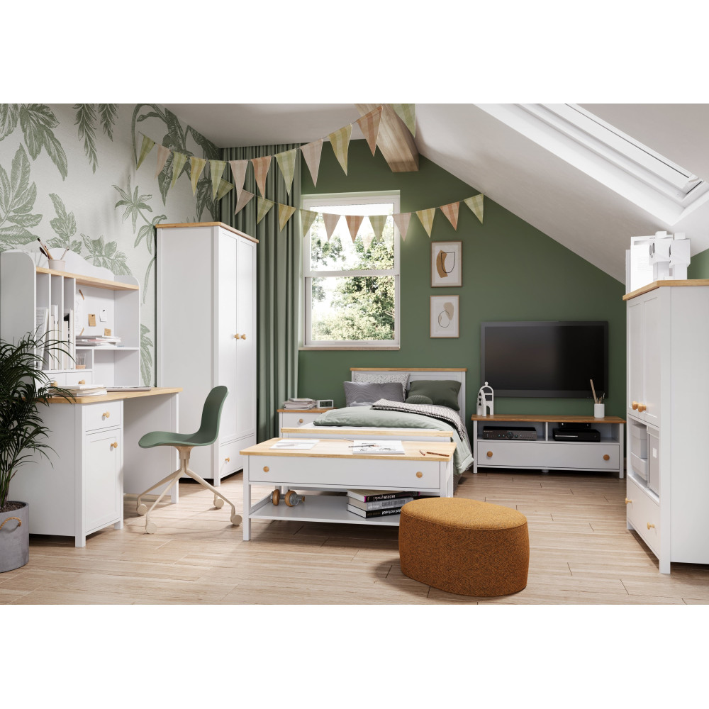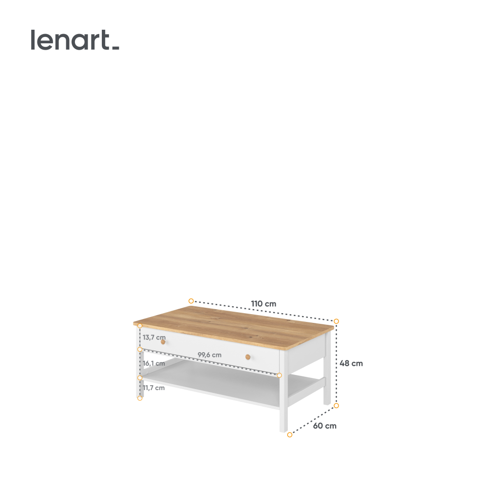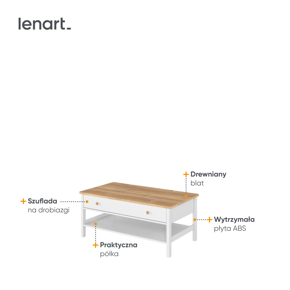 Funkcjonalny stolik wolnostojący w kolorze białym z drewnianym blatem to doskonałe rozwiązanie do każdego wnętrza. Posiada praktyczną półkę umieszczoną poniżej blatu, idealną do przechowywania książek czy dekoracji. Dodatkowo, wyposażony w pojemną szufladę na drobiazgi, zapewnia łatwy dostęp do najpotrzebniejszych przedmiotów. Dzięki swojemu estetycznemu wyglądowi i uniwersalnemu designowi, stolik wkomponuje się w różnorodne aranżacje, łącząc styl z funkcjonalnością.