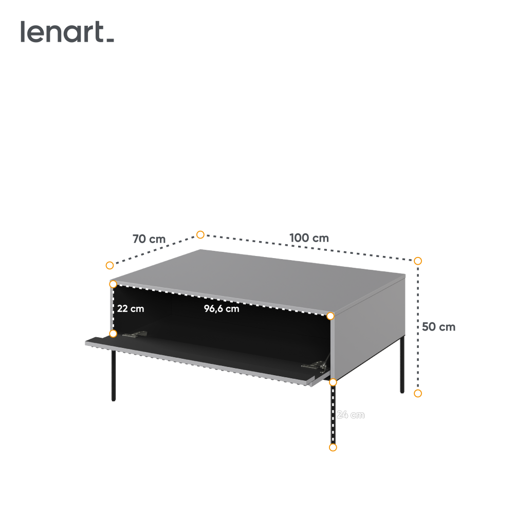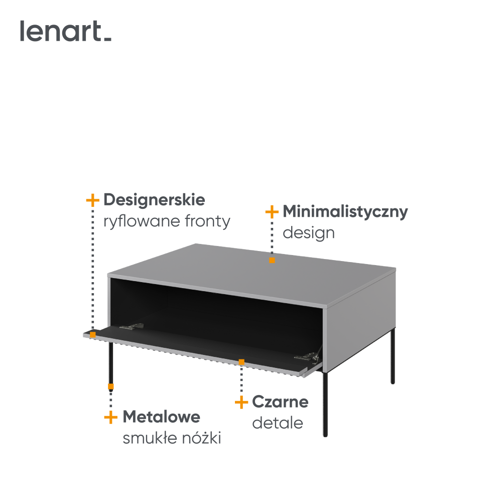 Szary stolik kawowy wyróżnia się eleganckim, ryflowanym frontem, za którym znajduje się pojemna półka, idealna do przechowywania drobiazgów, czasopism czy pilotów. Subtelny system push-open sprawia, że dostęp do półki jest niezwykle łatwy, a brak uchwytów nadaje całości nowoczesnego, minimalistycznego charakteru. Smukłe metalowe nóżki dodają konstrukcji lekkości i elegancji, tworząc harmonijne połączenie z unikalnym wzorem ryflowanym. To stylowy i funkcjonalny stolik kawowy, który doskonale wzbogaci każde nowoczesne wnętrze, nadając mu wyjątkowego uroku.