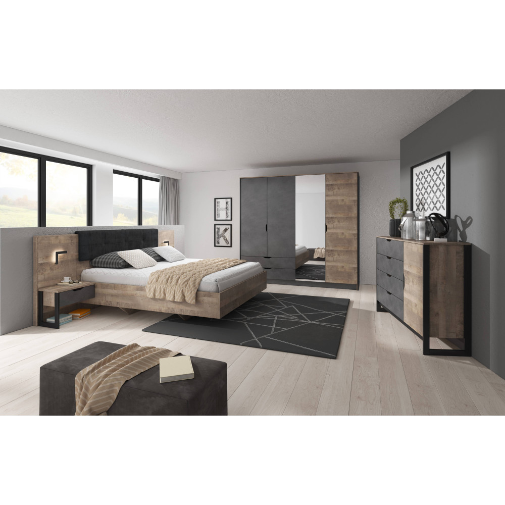 Arden to meble w oryginalnym industrialnym stylu. Połączenie dębu klepkowego z lekko porysowanym ciemnoszarym metalem nada wnętrzu niepowtarzalnego loftowego klimatu. Całość podkreślona została ramką z naturalnej sklejki w kolorze czarnym.