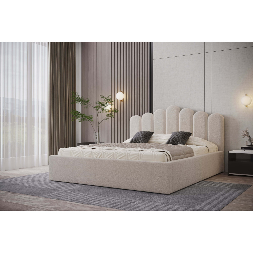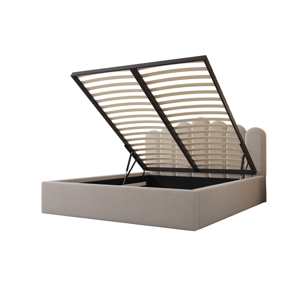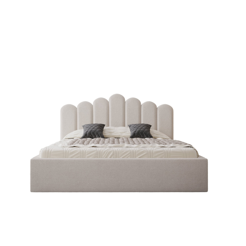 Wezgłowie wykonane z paneli tapicerowanych, obite pianką o grubości 3 cm, z eleganckim wykończeniem. Łóżko wyposażone w pojemnik na pościel, który zajmuje całą powierzchnię, zapewniając dodatkową przestrzeń do przechowywania. Wewnętrzna część łóżka wykończona solidnym wigofilem, nadając mu trwałość i estetyczny wygląd. Stelaż drewniany z 32 listwami zapewniający odpowiednie podparcie dla materaca, z opcją wyboru metalowego stelaża za dodatkową opłatą. Listwa wewnętrzna oraz pojemnik wykonane z białej płyty, dodające nowoczesności i elegancji. Łóżko dostępne w trzech różnych tkaninach: Magic Velvet, Now or Never oraz Monolith, aby dostosować je do indywidualnych preferencji i stylu sypialni.