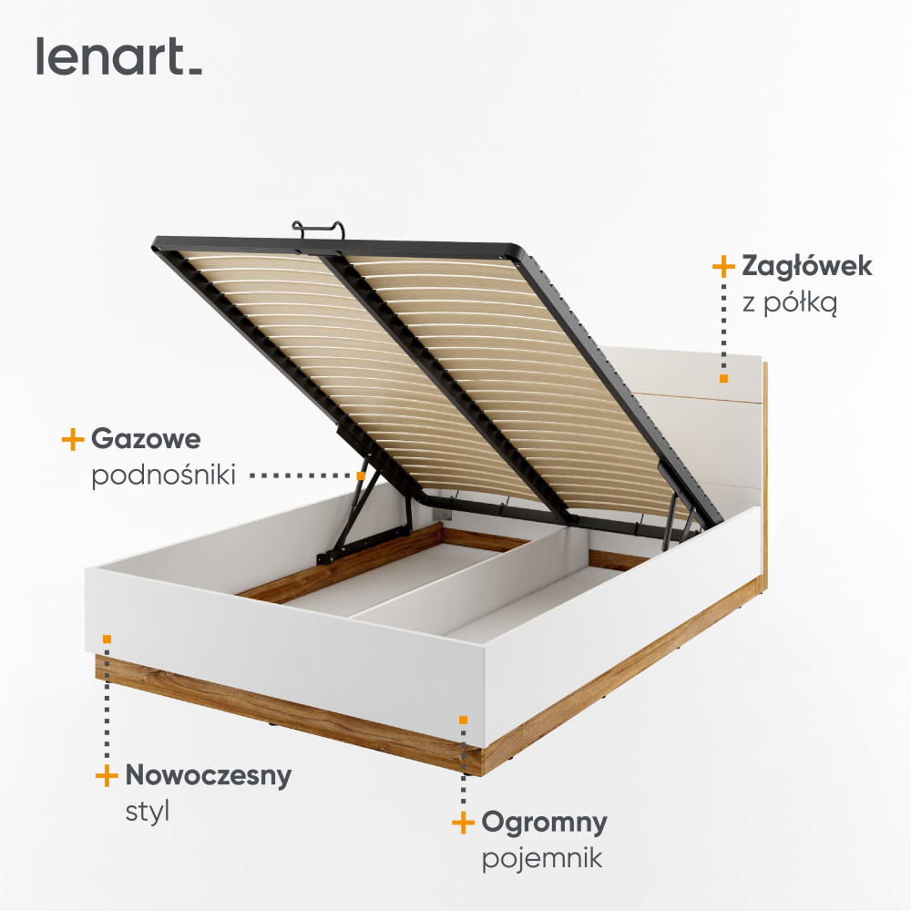 Nowoczesne łóżko przeznaczone do materaca o szerokości 160 cm. Posiada wytrzymały stelaż szczebelkowy zamocowany na metalowej ramie oraz pojemny schowek na pościel, który dzięki gazowym podnośnikom umożliwia łatwe podnoszenie i opuszczanie ramy z materacem, maksymalnie wykorzystując przestrzeń pod łóżkiem.