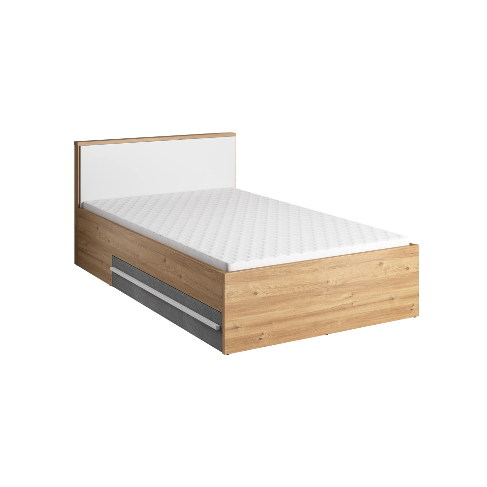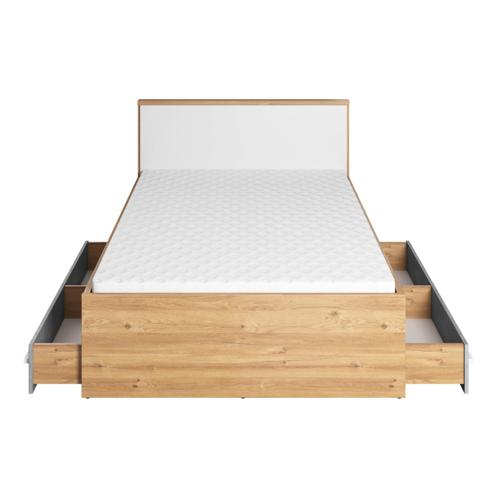Eleganckie łóżko w nowoczesnym stylu, które doskonale wzbogaci każde wnętrze sypialni. Wysoki zagłówek zapewnia wygodne oparcie podczas wieczornego czytania czy oglądania ulubionego filmu. Pod łóżkiem znajdują się dwie pojemne szuflady po obu stronach, które oferują dodatkową przestrzeń na przechowywanie. Ciekawy efekt wizualny tworzy proste połączenie kolorów – skrzynia wykonana jest z dekoru przypominającego ciepłe drewno, front szuflady jest w kolorze szarego betonu, a zagłówek zaakcentowano subtelną bielą. Łóżko dostępne jest bez materaca, co pozwala na wybór odpowiedniego rozwiązania dla siebie. Idealne zarówno do pokojów dziewcząt, jak i chłopców.