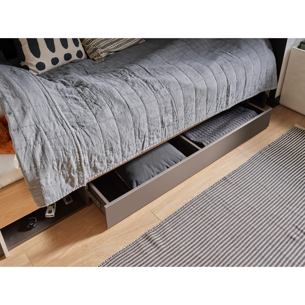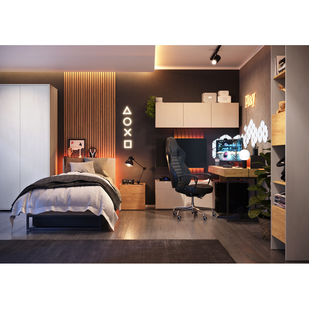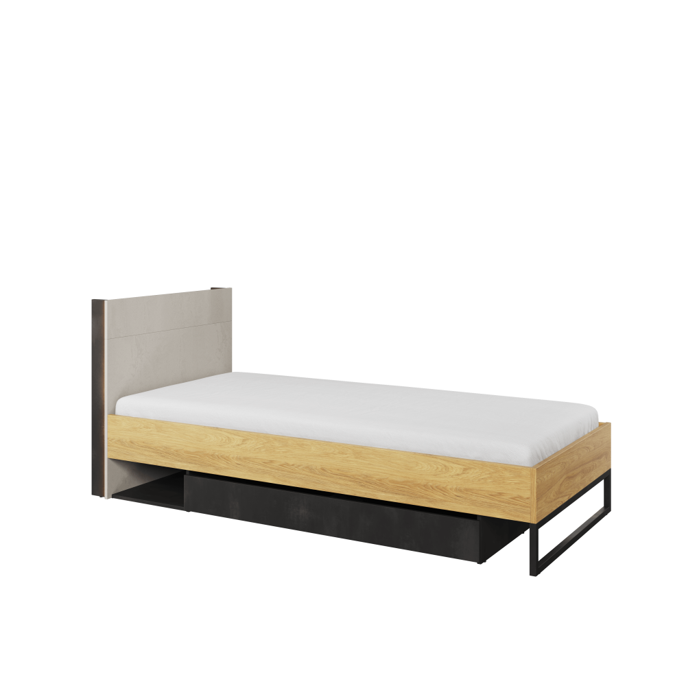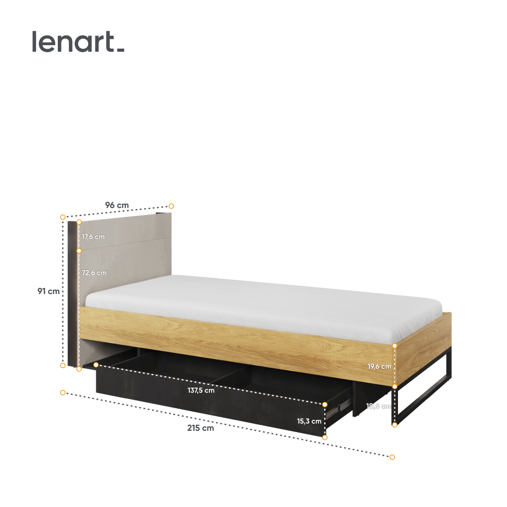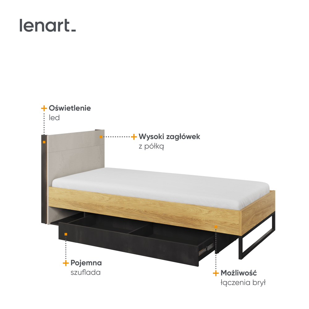 Wygodne i ponadczasowe łóżko młodzieżowe w kolorach ciemnej stali, szarości oraz dębu hikora to idealne rozwiązanie dla nowoczesnych wnętrz. Łóżko posiada solidny stelaż szczebelkowy oraz wysoki zagłówek, który zapewnia wygodne oparcie i dodatkową funkcjonalność dzięki wbudowanej praktycznej półce – idealnej na książki, zegarek czy inne drobiazgi. Energetyzujące oświetlenie w pomarańczowej barwie subtelnie podkreśla nowoczesny design, dodając wnętrzu dynamicznego akcentu. Dodatkowo, w dolnej części łóżka zaplanowano pojemną szufladę, idealną do przechowywania pościeli lub sezonowych rzeczy, co zwiększa funkcjonalność mebla.
