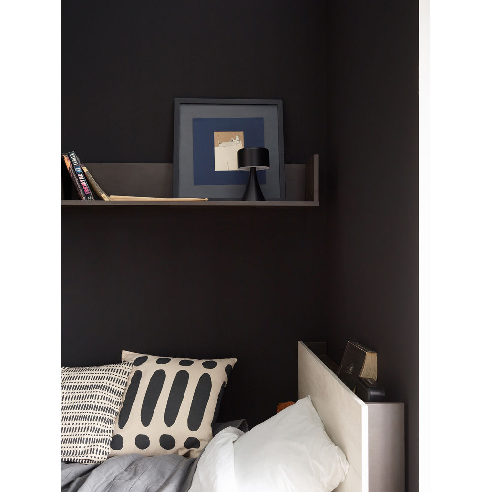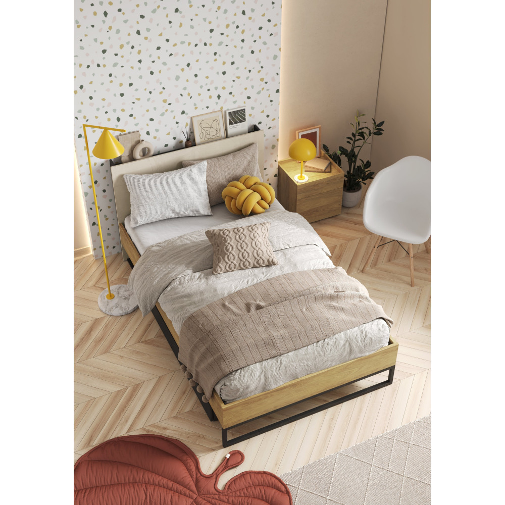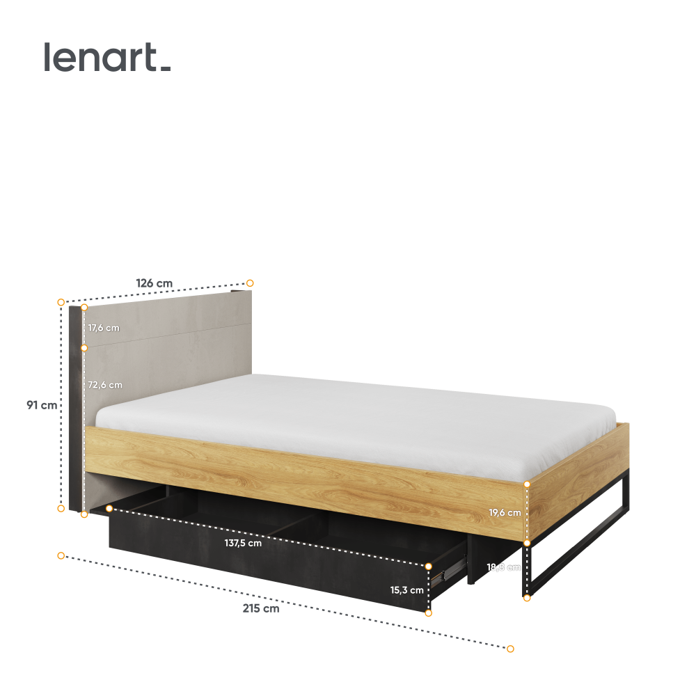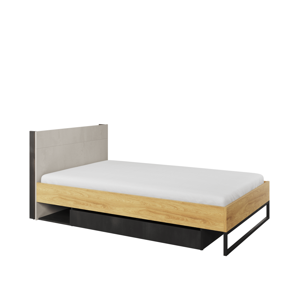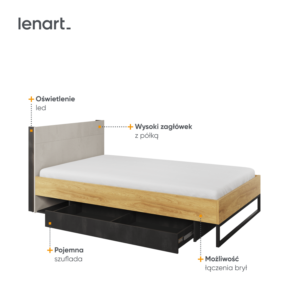 Wygodne i ponadczasowe łóżko młodzieżowe w kolorach ciemnej stali, szarości oraz dębu hikora to idealne rozwiązanie dla nowoczesnych wnętrz. Łóżko posiada solidny stelaż szczebelkowy oraz wysoki zagłówek, który zapewnia wygodne oparcie i dodatkową funkcjonalność dzięki wbudowanej praktycznej półce – idealnej na książki, zegarek czy inne drobiazgi. Energetyzujące oświetlenie w pomarańczowej barwie subtelnie podkreśla nowoczesny design, dodając wnętrzu dynamicznego akcentu. Dodatkowo, w dolnej części łóżka zaplanowano pojemną szufladę, idealną do przechowywania pościeli lub sezonowych rzeczy, co zwiększa funkcjonalność mebla.