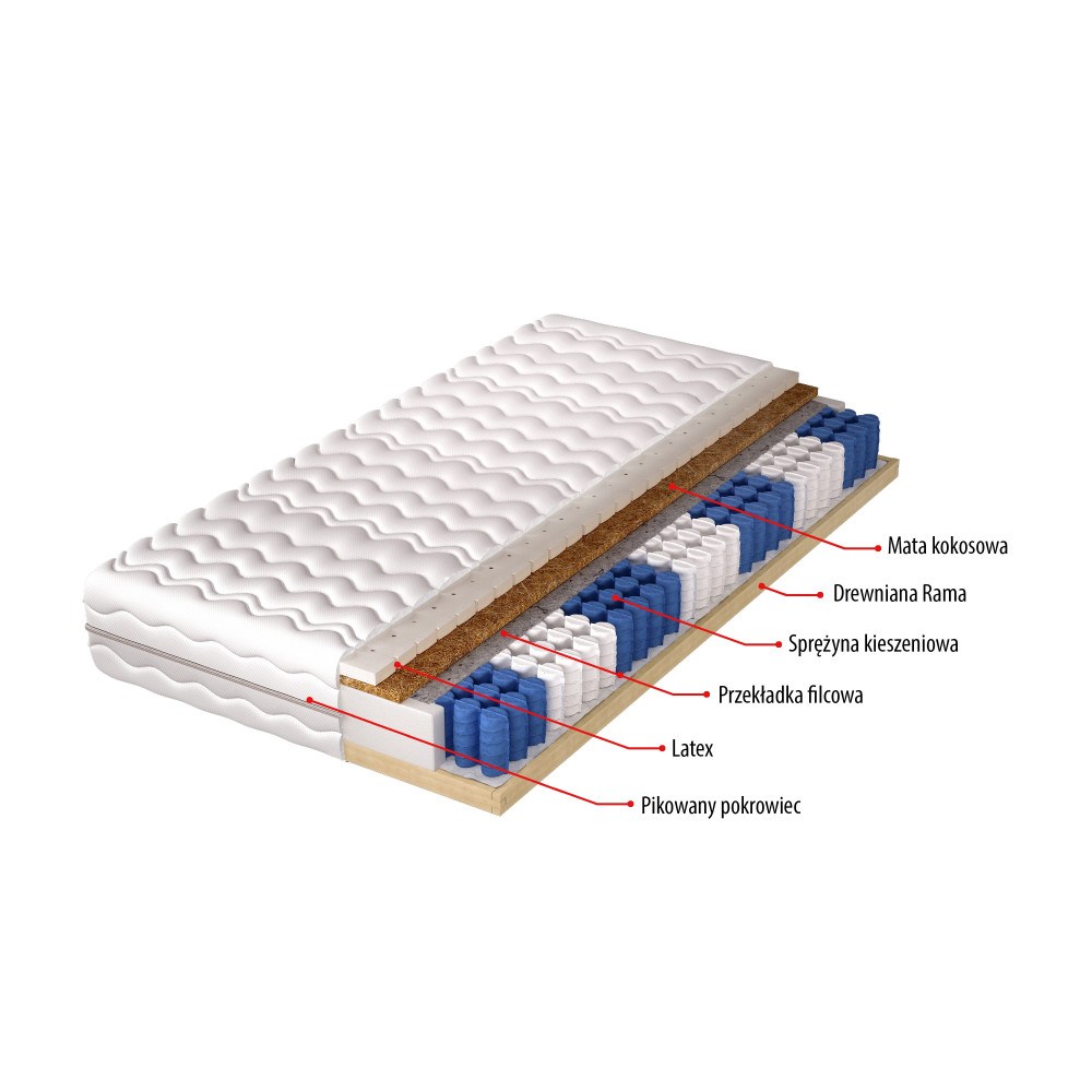 - Rama: Solidna rama wykonana z drewna zapewnia stabilną podstawę dla całej konstrukcji, co gwarantuje trwałość i wytrzymałość materaca.