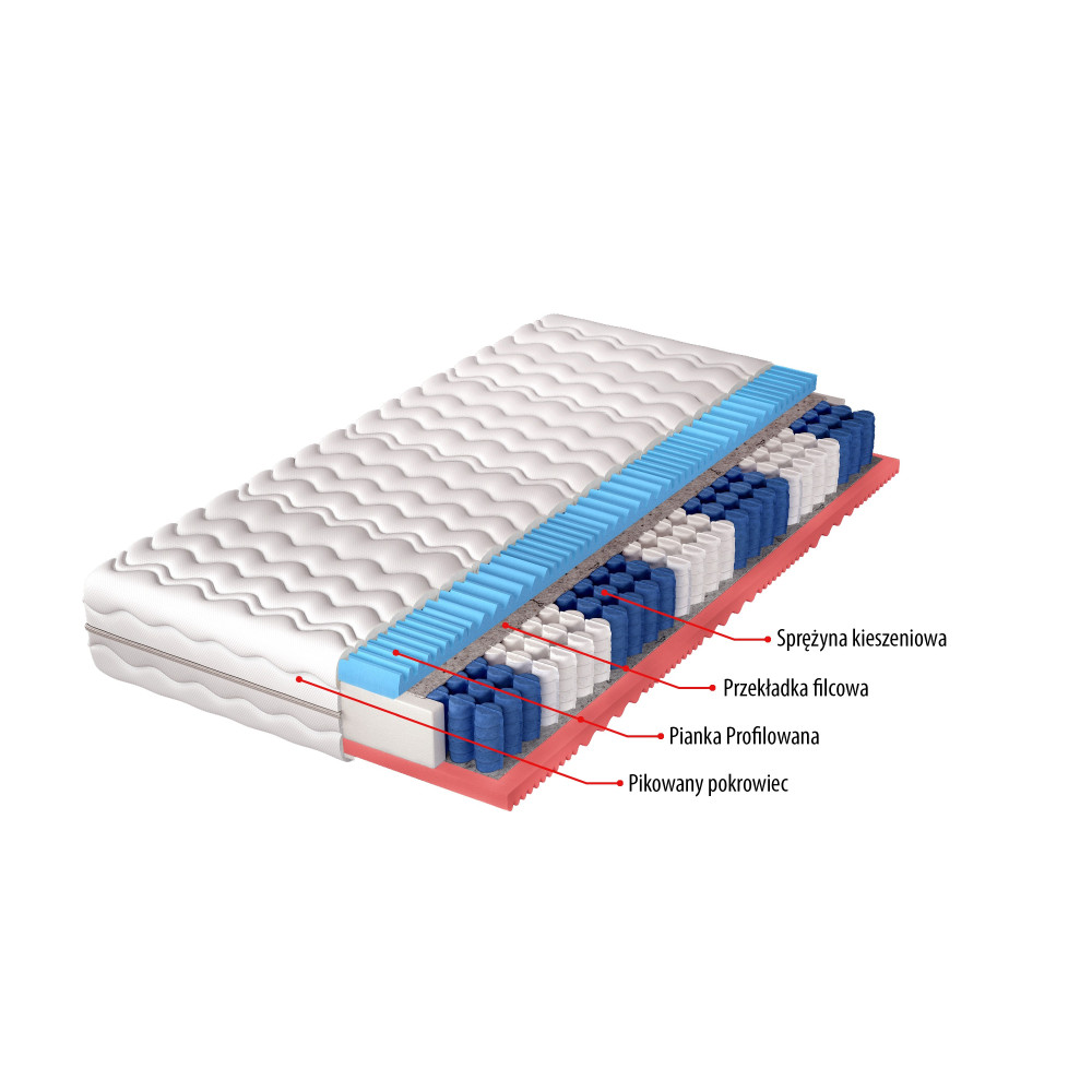 Posiada sprężyny kieszeniowe, które są rozmieszczone na 7 stref twardości. Oznacza to, że różne obszary materaca mają różne stopnie twardości, dzięki czemu dostosowuje się do różnych części ciała , zapewniając odpowiednie wsparcie dla kręgosłupa. Wkład dodatkowo obłożony przekładką z filcu. Obie strony materaca mają warstwę pianki profilowanej T25 o grubości 3 cm. Pianka ma kształt fali, która dostosowuje podparcie dla różnych obszarów ciała.