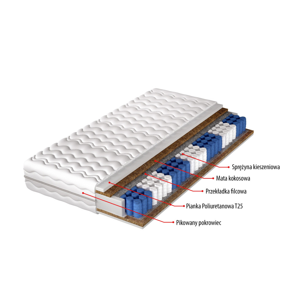 Posiada sprężyny, które są umieszczone każda w osobnej kieszeni. Każda sprężyna pracuje niezależnie. Sprężyny są podzielone na 7 stref twardości, co daje różne stopnie twardości. Dzięki temu dostosowuje się do różnych części ciała. Wkład jest obłożony filcem. Z obu stron materaca znajduje się wkładka z kokosu o grubości 1 cm. Koks zapewnia dodatkową wentylację. Obie strony materaca mają warstwę pianki T25 o grubości 2 cm. Pianka pełni rolę warstwy komfortowej, dostosowuje się do kształtu ciała i zapewnia wsparcie materaca.